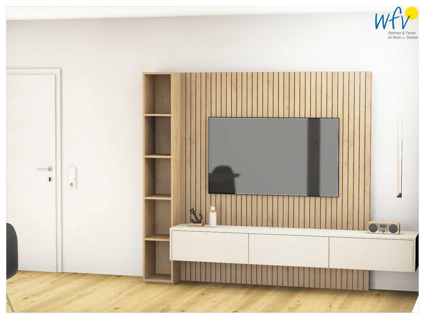 Schlicht und elegant lädt das Wohnzimmer mit bequemem Sofa und großem Esstisch zum Relaxen, zu gemütlichen Fernsehabenden und zu gemeinsamen Mahlzeiten ein. Von hier aus gelangen Sie auf den Balkon mit malerischem Blick in Wangerooges weite Dünenlandschaft - perfekt zum Ausspannen, Lesen oder Beisammensein.