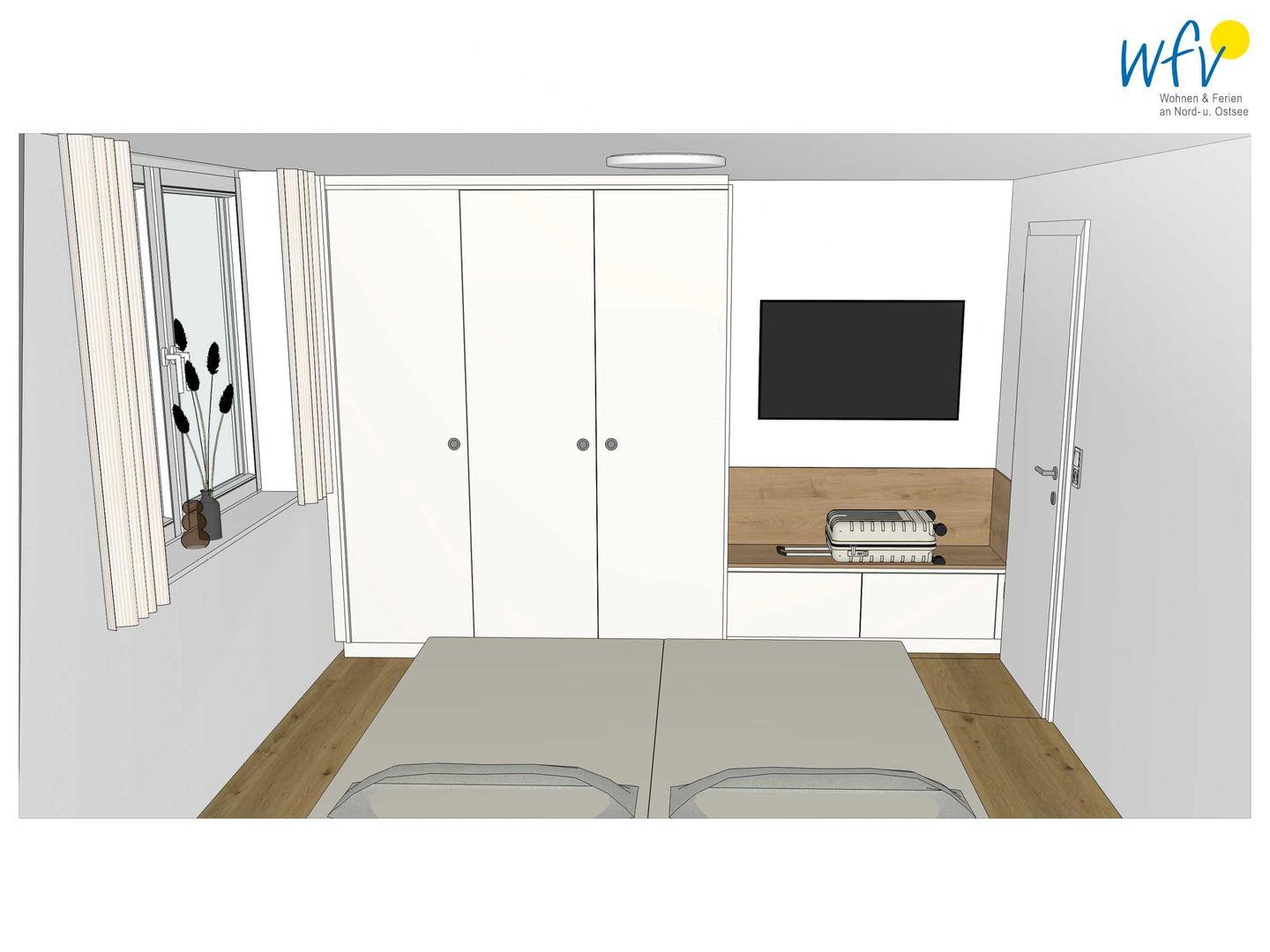Wunderbar ausruhen und ausschlafen können Sie in dem separaten Schlafzimmer mit maßgefertigtem Doppelbett. Ein modernes SmartTV ermöglicht hier gemütliches Fernsehen vom Bett aus. Platz für Ihre Urlaubsgarderobe bietet ein geräumiger und maßgefertigter Einbauschrank.