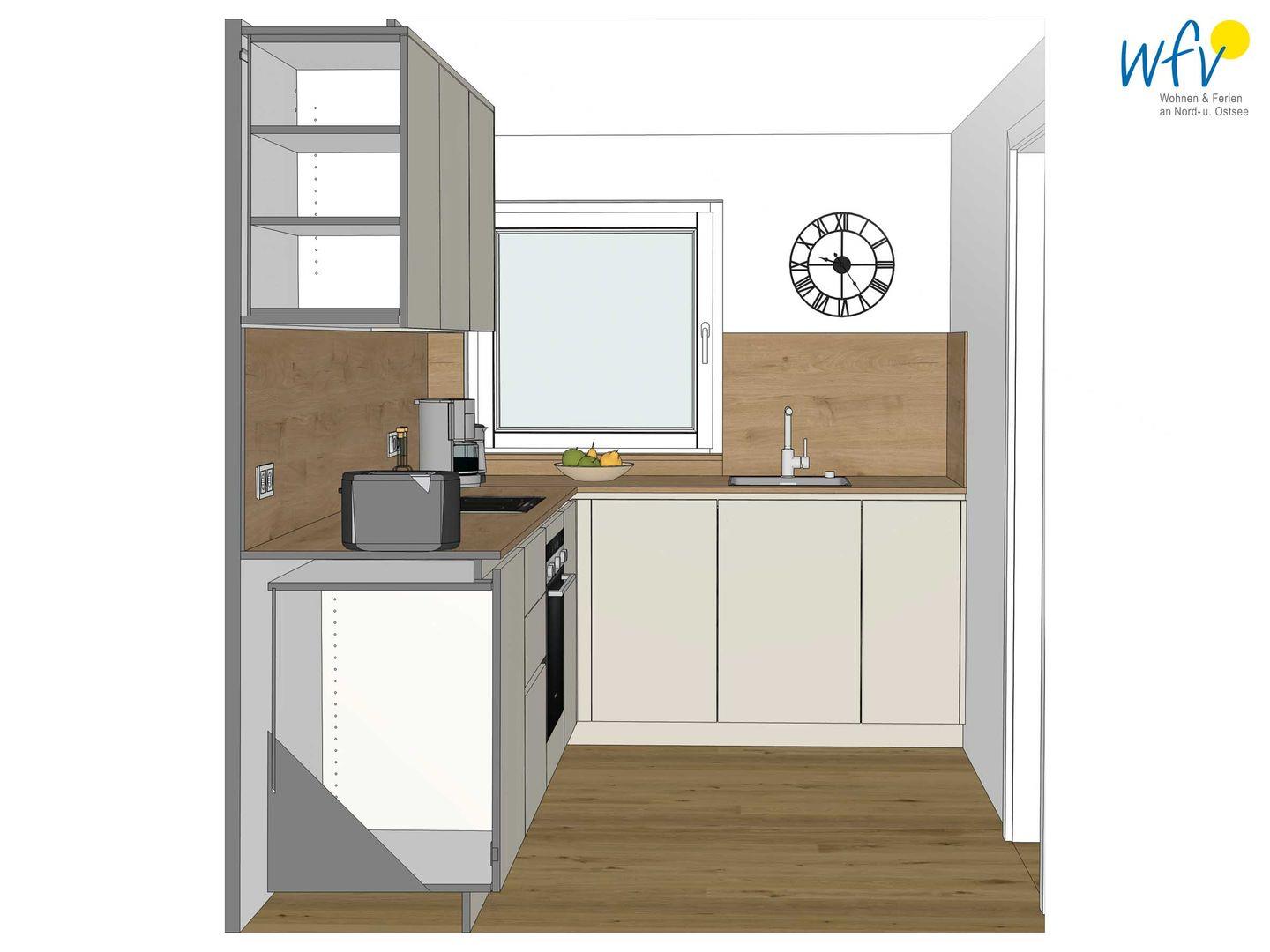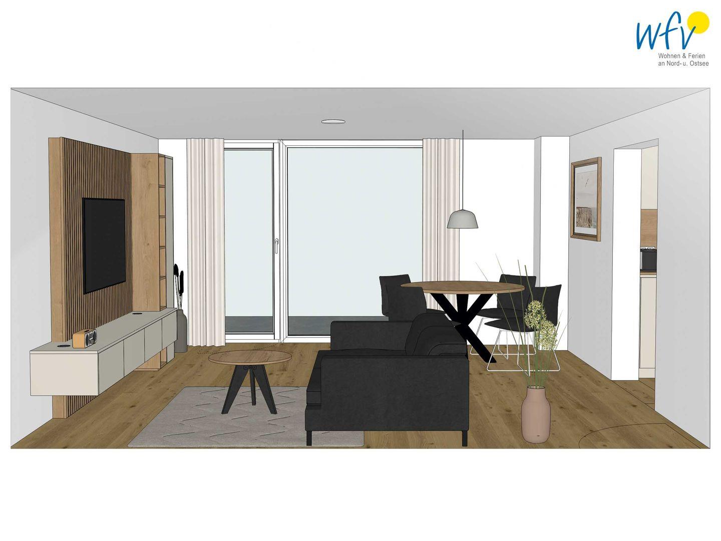 Großzügige 66 m² Wohnfläche und bodentiefe Fenster bieten Ihnen ein weites Raumgefühl. Der helle Wohnbereich mit einem Ensemble aus bequemer Couchecke, modernem SmartTV und rundem Esstisch lädt nach dem Strandspaziergang zur Entspannung ein. Vom Wohnzimmer aus gelangen Sie direkt auf die Terrasse / Garten. Ideal zum Ausspannen, Lesen oder um den Tag bei einem Glas Wein ausklingen zu lassen.