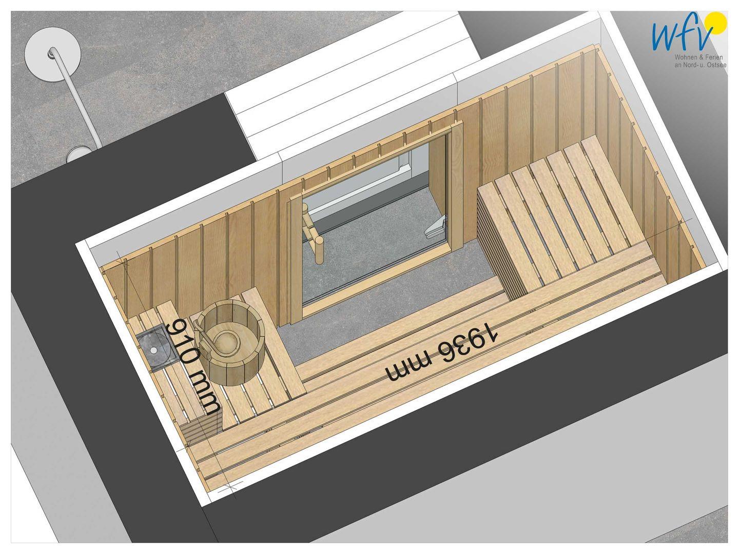 Die wohnungseigene Sauna ist über den Garten/Terrasse begehbar. Von dort aus kommen Sie auch zur Außendusche der Wohnung.