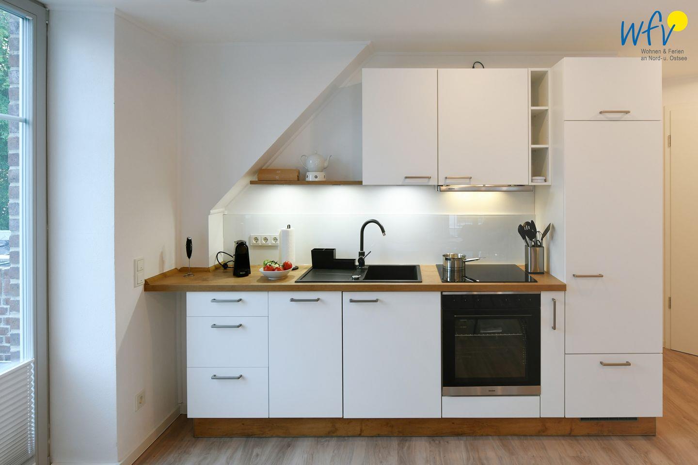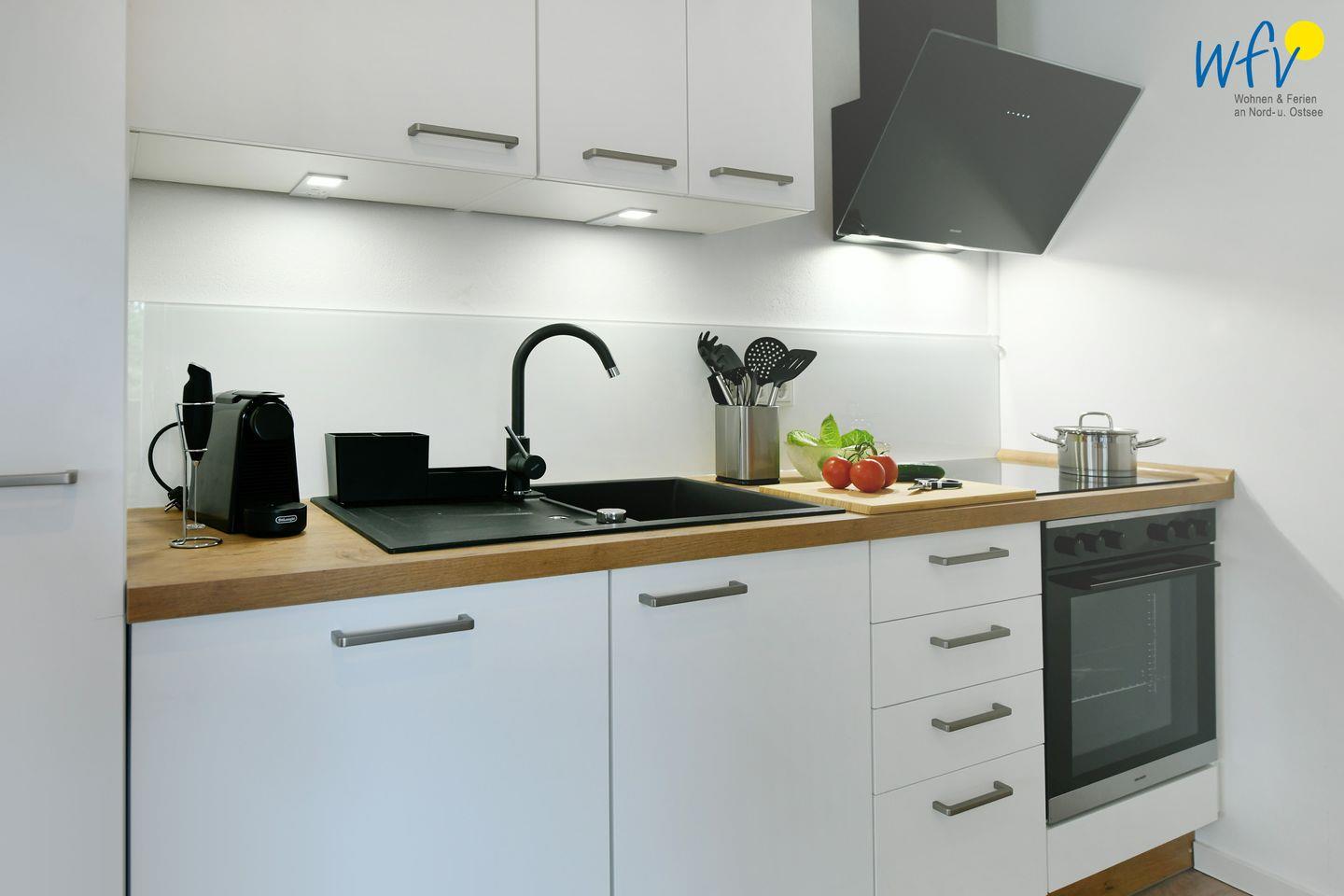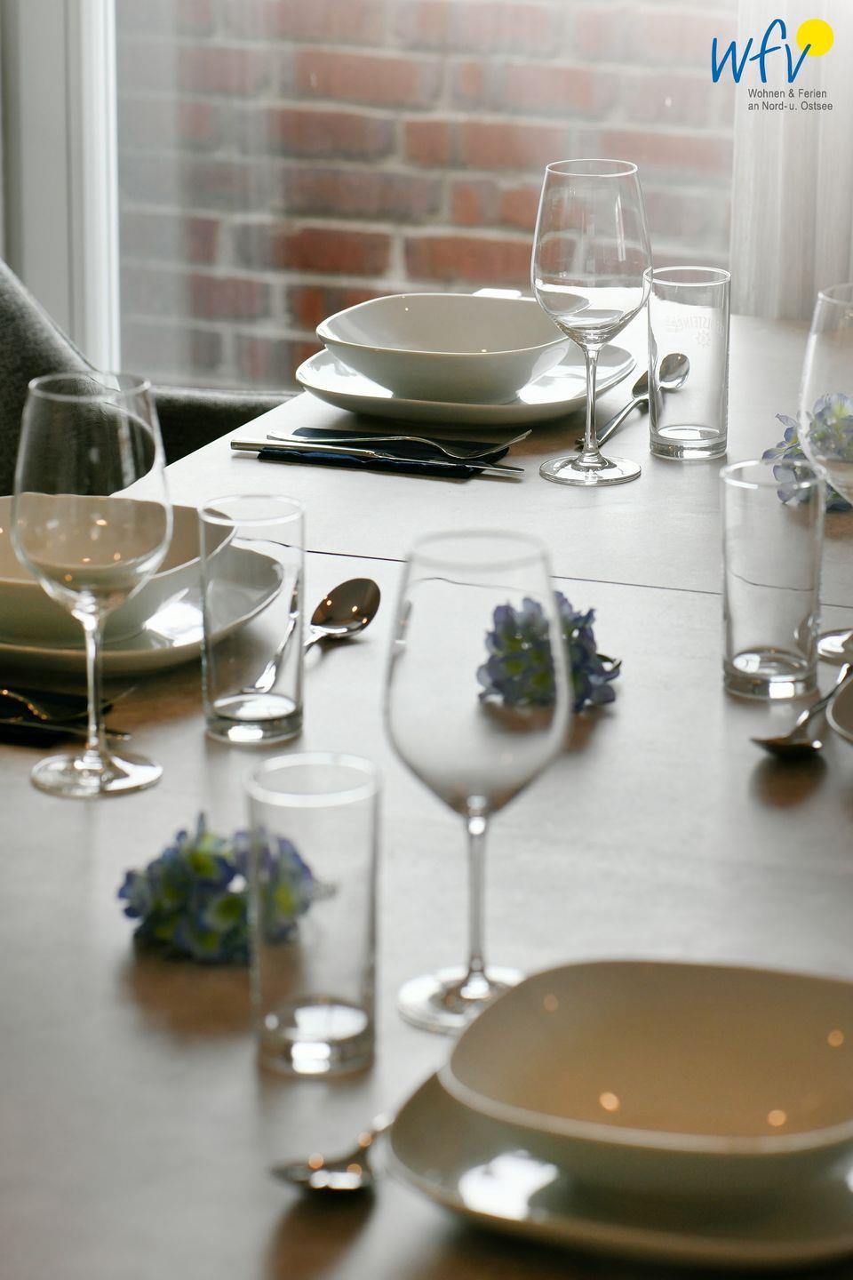 Die Küche ist umfassend eingerichtet und unterstützt eine flexible Selbstversorgung. Dazu gehören Herd, Backofen, Mikrowelle, Kühlschrank, Spülmaschine, Kaffeemaschine, Wasserkocher, Toaster und Mixer. Ein Esstisch lädt zu gemeinsamen Mahlzeiten in geselliger Runde ein. Auch für längere Aufenthalte ist die Ausstattung durchdacht: Waschmaschine und Trockner stehen gemeinschaftlich zur Nutzung bereit, ebenso Bügeleisen, Bügelbrett, Wäscheständer und Staubsauger.