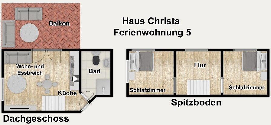 Die Doppelwohnungen 5 und 6 im Haus Christa bieten auf 182 m² viel Platz für bis zu 12 Personen. Die Ferienwohnung verfügt über 8 Zimmer, 6 Schlafzimmer, 3 Badezimmer, Küche, Wohnzimmer, Balkon und Terrasse. WLAN, 2 TVs, Spülmaschine sowie gemeinschaftlich nutzbare Waschmaschine und Trockner sorgen für Komfort. Familien freuen sich über Babybett, Hochstuhl, Treppengitter, Gartenmöbel, Gartenhaus und Sauna.
