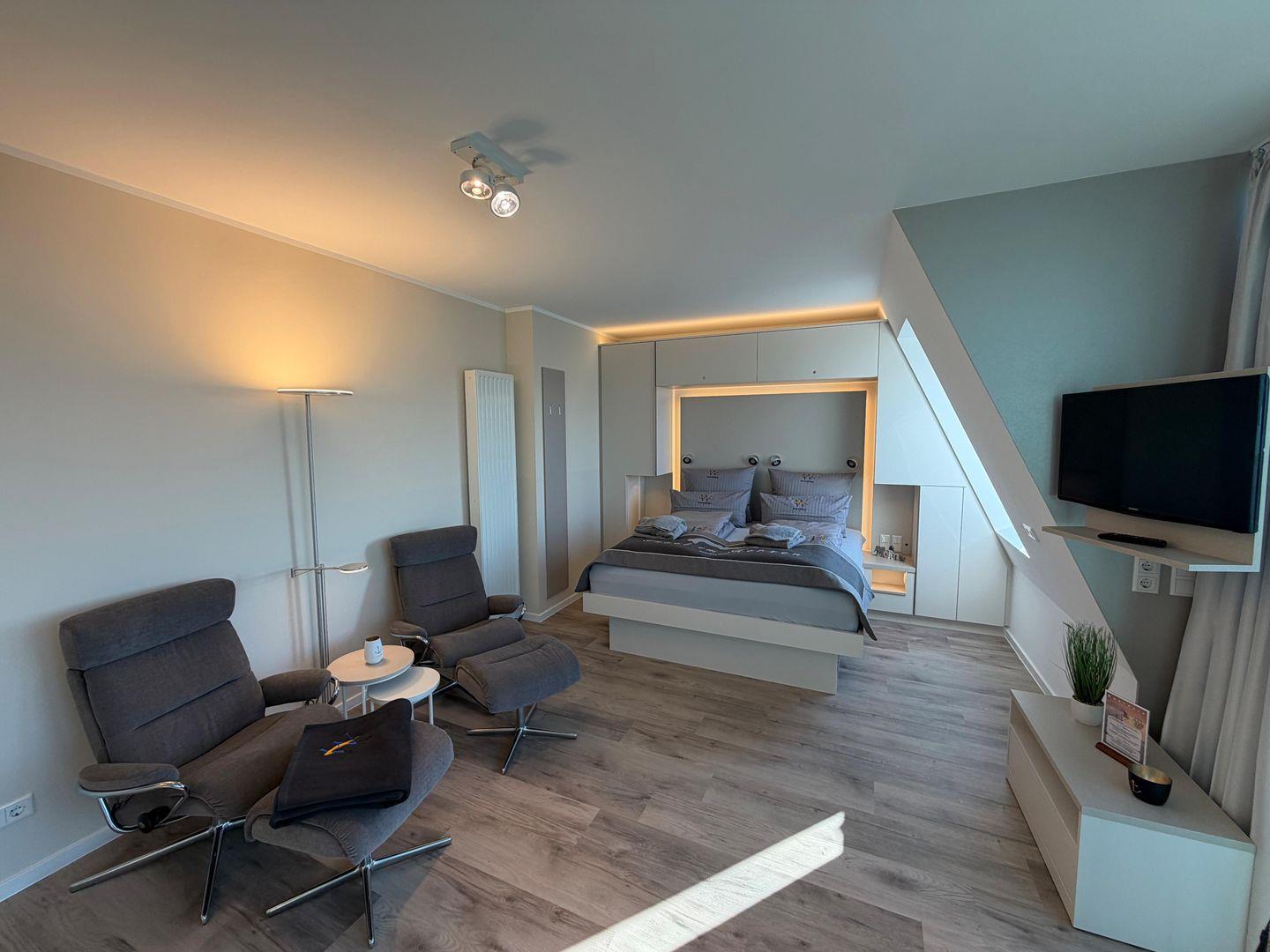 Stilvolles Aparthotel-Appartement auf Wangerooge mit Balkon und Wattenmeerblick, nur 10 m vom Strand entfernt.