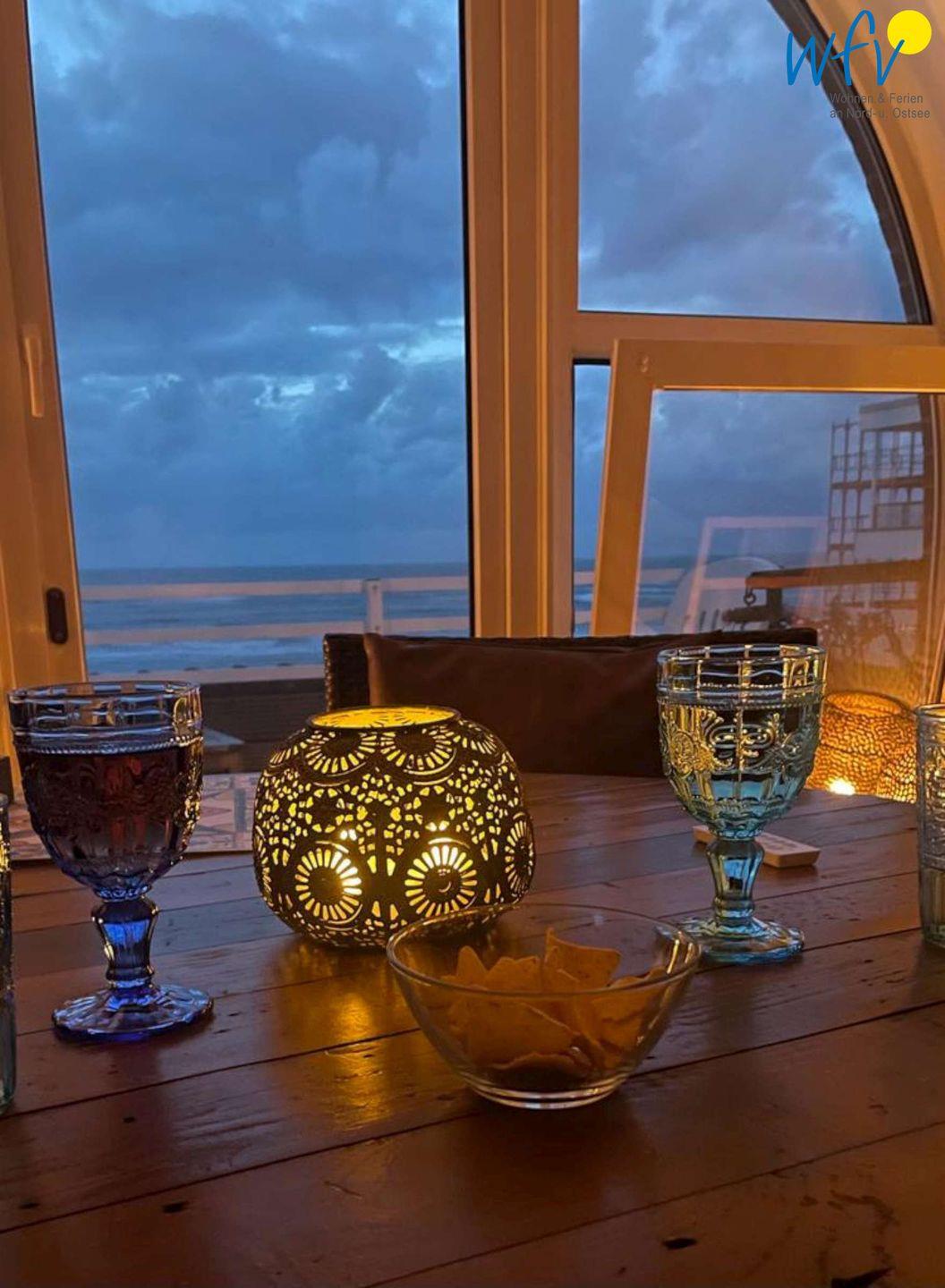 Eine gemütlichen Couchecke mit Sesseln und TV lädt in der Wohnung mit Strandblick zum Relaxen ein. Hier kann man ein gutes Buch lesen, einen Film schauen, Musik hören oder vom Smartphone aus entspannt im Internet surfen. Internet, WLAN und ein Internetradio sind vorhanden. In den Genuss traumhafter Urlaubsmomente kommen Sie aber vor allem, wenn Sie an unserem gemütlichen runden Esszimmertisch Platz nehmen. Von hier aus haben Sie an jedem einzelnen Tag des Jahres und zu jeder Stunde eines Tages diesen atemberaubenden Blick auf das Meer, egal wie das Wetter ist. Hier werden Sie Ihr Frühstück oder eine andere Mahlzeit einnehmen oder einfach nur sitzen und auf das Meer schauen. Durch eine indirekte Beleuchtung kann das Rundbogenfenster am Abend das Zimmer in einen romantischen Ort mit Meerblick verwandeln. Sie wollen die Wohnung dann gar nicht mehr verlassen.