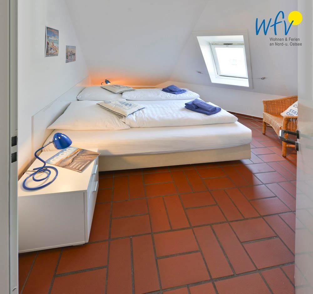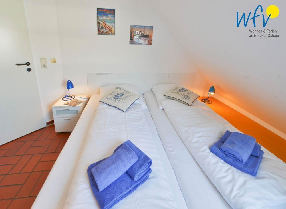 Das separate Schlafzimmer der "Ferienwohnung Meerblick 18" besteht aus 2 zu einem Doppelbett zusammengestellten Betten und bietet auf einer Breite von 180 cm Platz für 2 Personen. Eine Ausweichschlafmöglichkeit für eine Person bietet die Bettcouch im Wohnbereich. 2 Personen, in Ausnahmefällen auch drei, können so in der Wohnung einen erholsamen Urlaub verbringen.