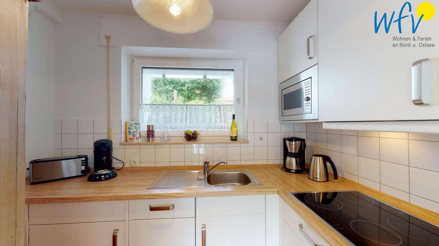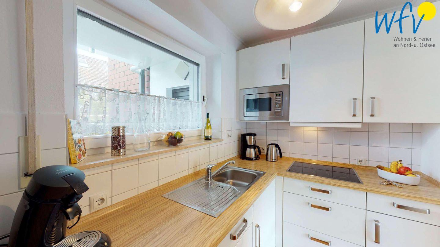 Die geräumige Küche ist vom Wohnzimmer abtrennbar und verfügt über moderne Geräte, inklusive Geschirrspülmaschine und 4-Platten-Ceran-Feld.