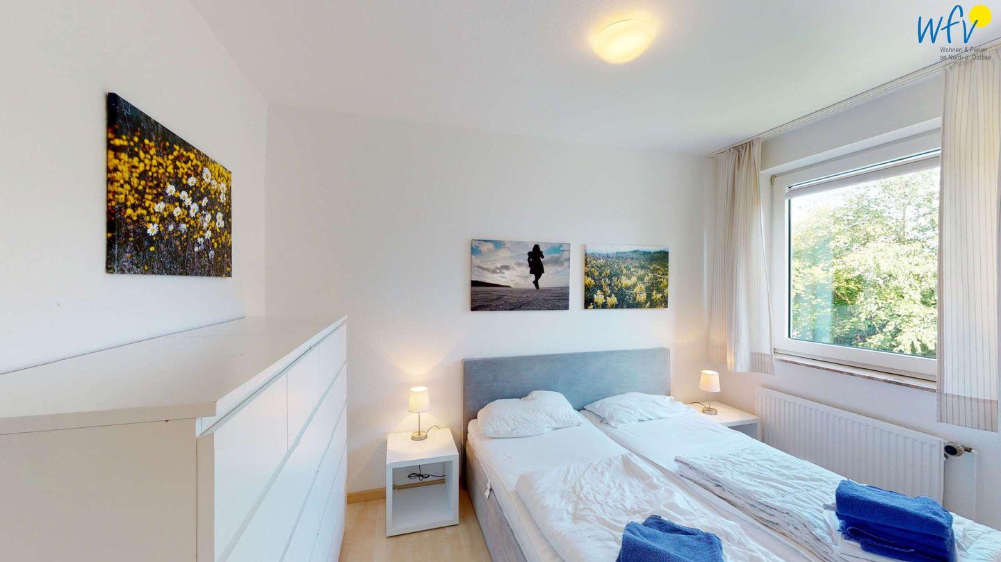 Das separate Schlafzimmer der Ferienwohnung ist mit einem bequemen Doppelbett (1,70m) ausgestattet. Ihre Urlaubsgarderobe findet in der geräumigen Kommode Platz.