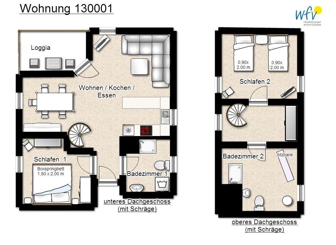 Diese komfortable Wangerooger Ferienwohnung bietet Ihnen auf zwei Etagen viel Gemütlichkeit! Besonders in der wunderbar geschützten Loggia können Sie nach einem Strandtag oder einer Fahrradtour ganz entspannt die Seele baumeln lassen.