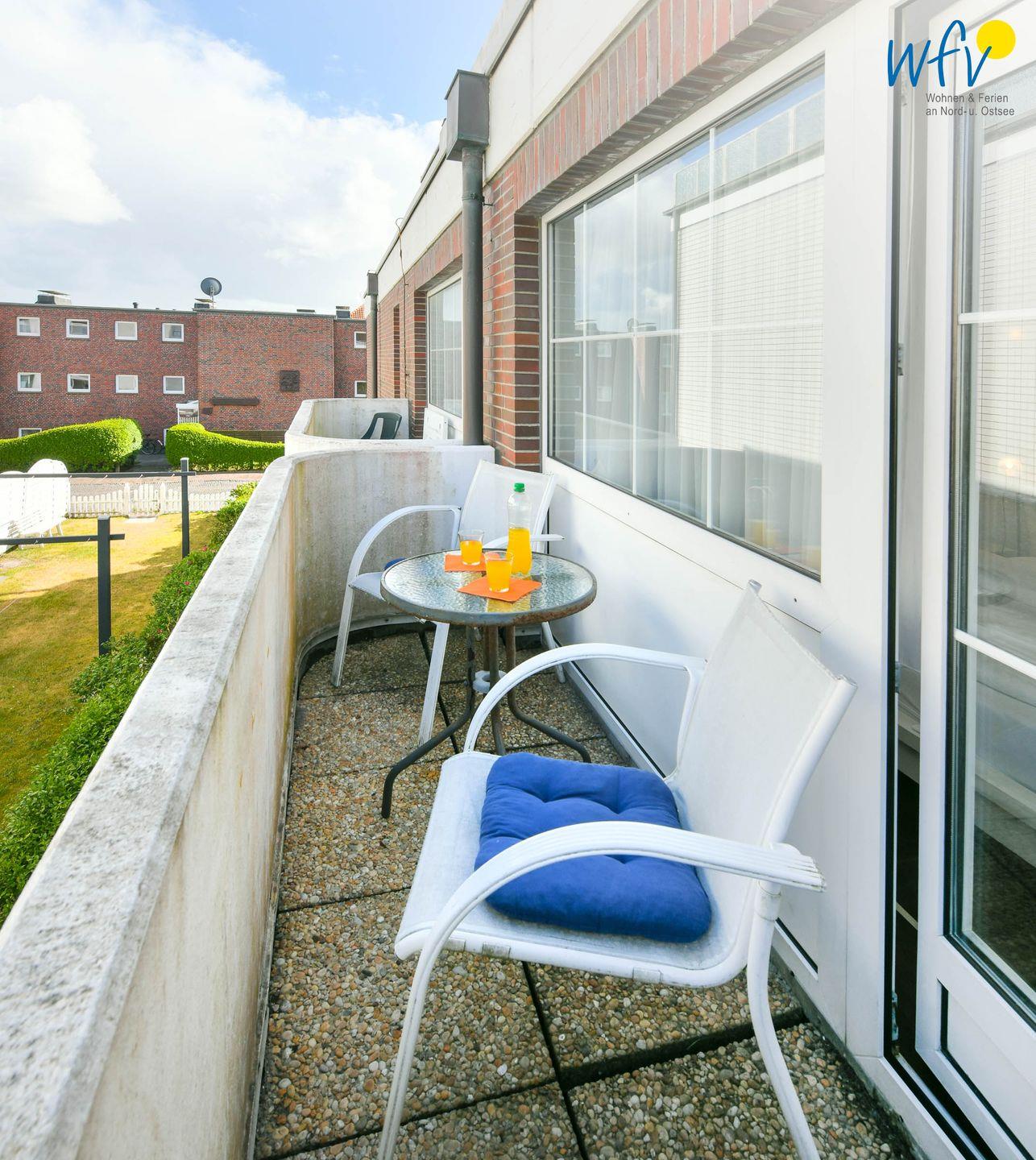Wunderbar ausspannen können Sie auch auf dem Ost-Balkon der Ferienwohnung! Von hier aus sehen Sie bereits die Nordsee. Der Genuss aus Meeresbrise und wärmenden Sonnenstrahlen ist eine Garantie für unvergessliche Urlaubsmomente auf der schönen Insel Wangerooge!