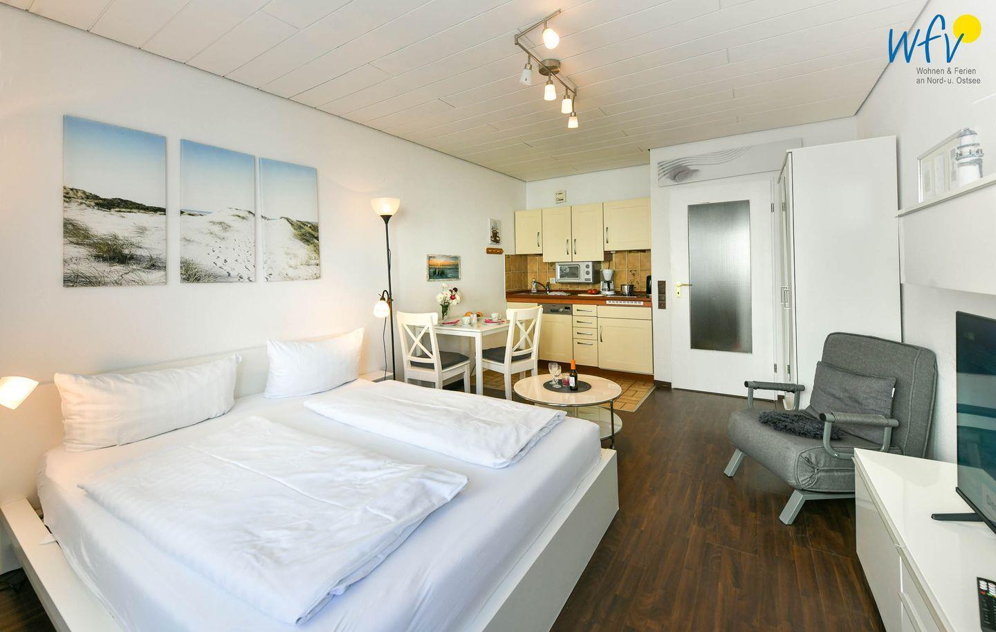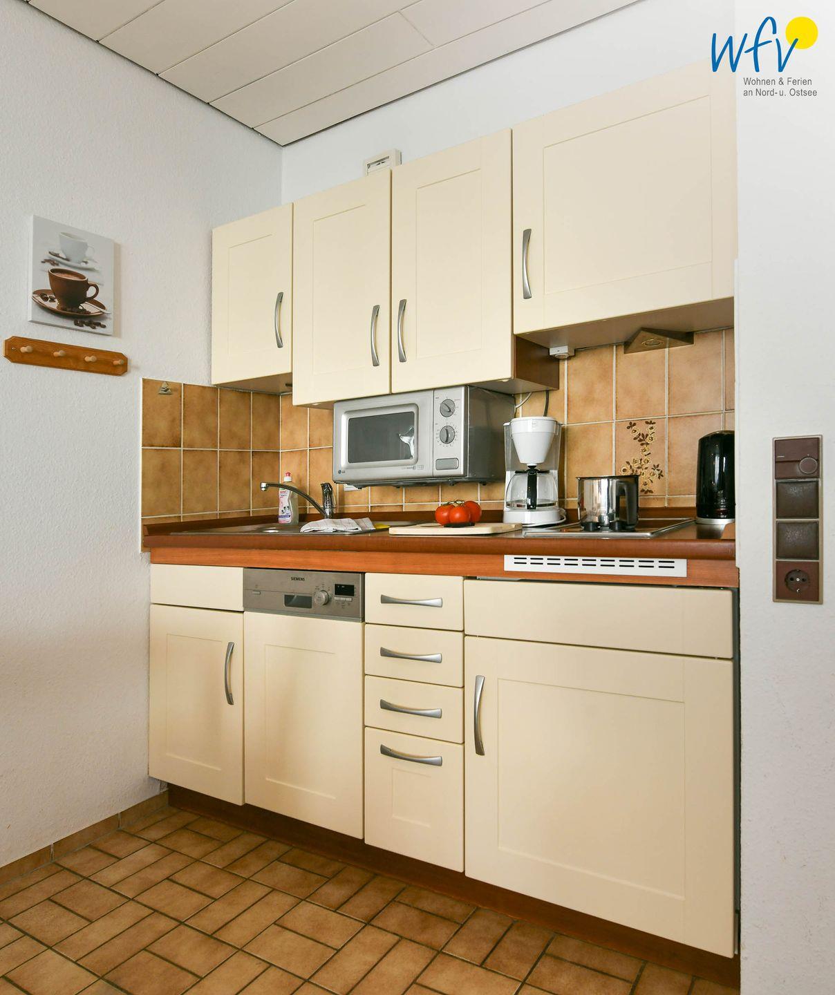 Machen Sie es sich in Ihrem Urlaub gemütlich! Vom ausgiebigen Ferienfrühstück am Esstisch, über bequeme Zeiten im Relaxsessel bis hin zum langen Ausschlafen in dem modernen Doppelbett (1,80 m x 2,00 m) - der große Wohnraum bietet Ihnen ein Rundum-Paket zum Wohlfühlen! Für den Snack zwischendurch oder das leckere Abendessen steht Ihnen eine Küchenzeile mit 2-Platten-Cerankochfeld, Geschirrspüler und Mikrowelle zur Verfügung.