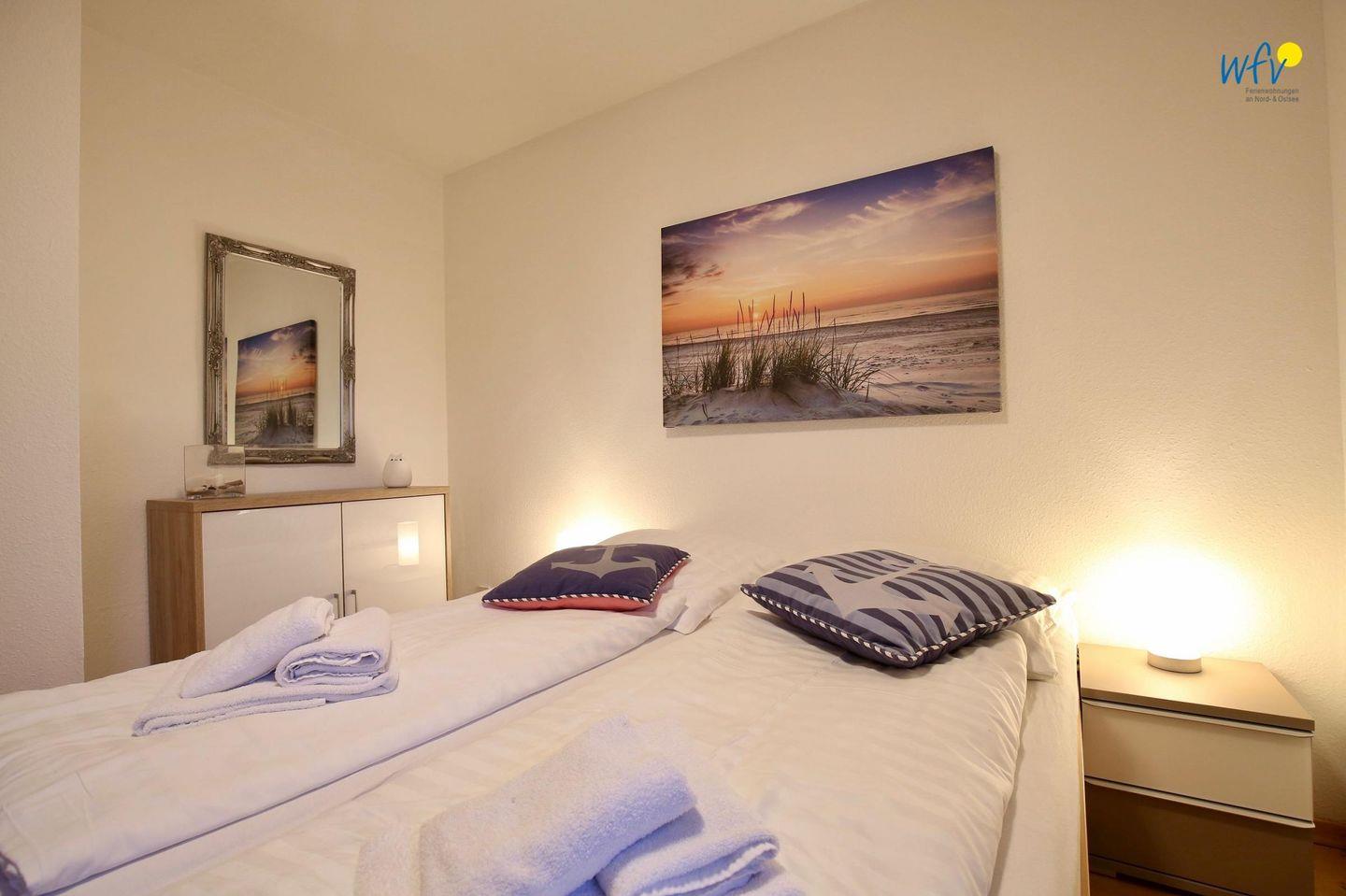 Das separate Schlafzimmer der Ferienwohnung auf Wangerooge ist mit feststehenden Betten ausgestattet. Weitere Schlafmöglichkeiten bestehen durch ein Schrankbett in dem gemütlichen Wohnraum.
