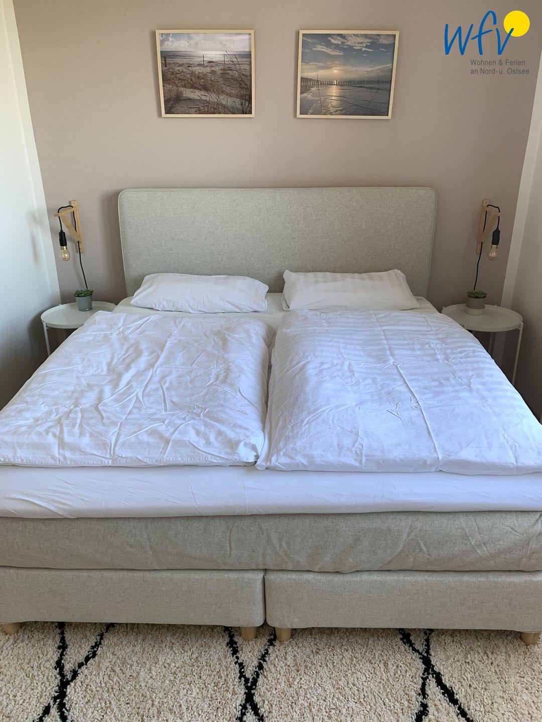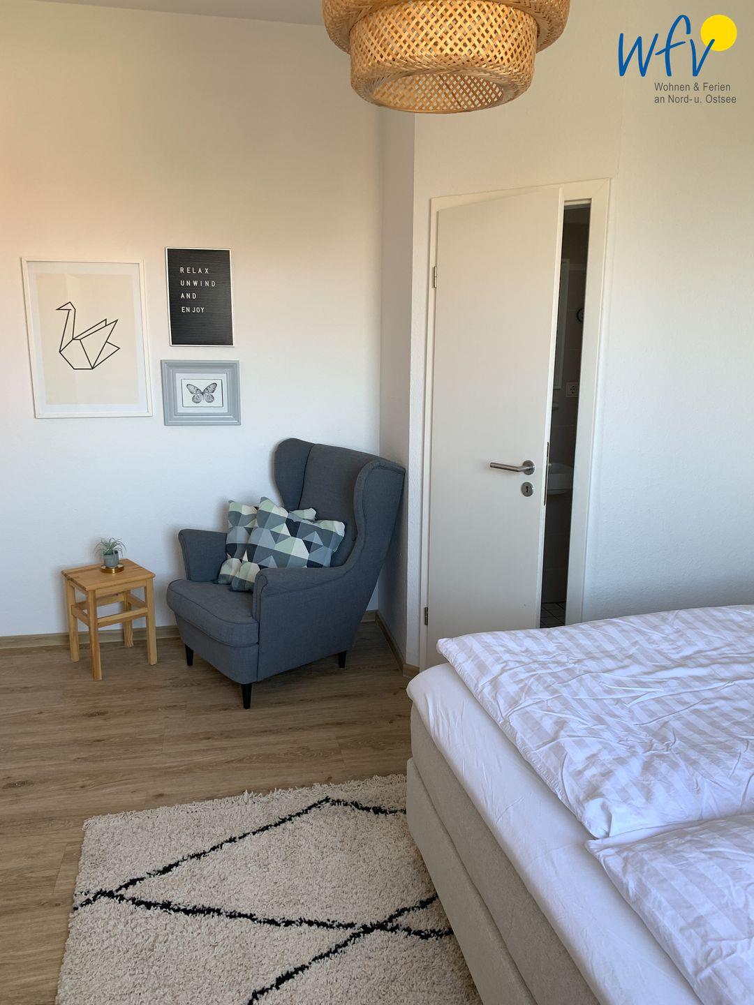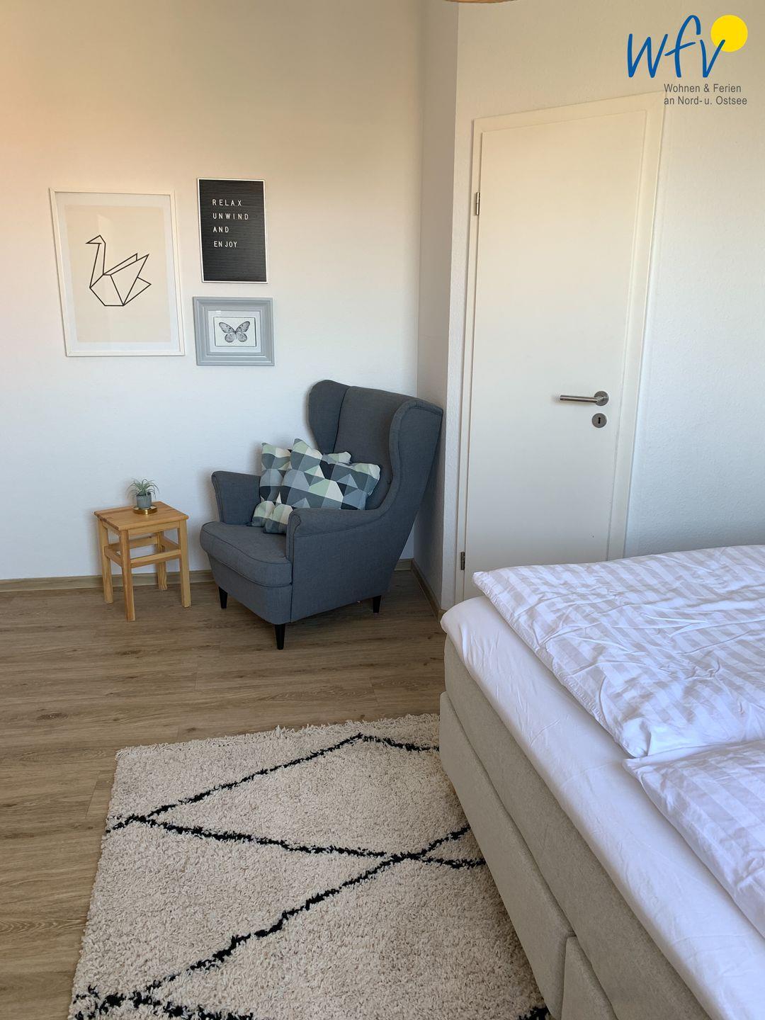 Das separate Schlafzimmer der Wangerooger Ferienwohnung ist mit einem 1,80 m breiten Doppelbett, einem gemütlichen Ohrensessel und einem zweiten TV ausgestattet. Es besteht ausreichend Platz, um ein Kinderbett hinzuzustellen.