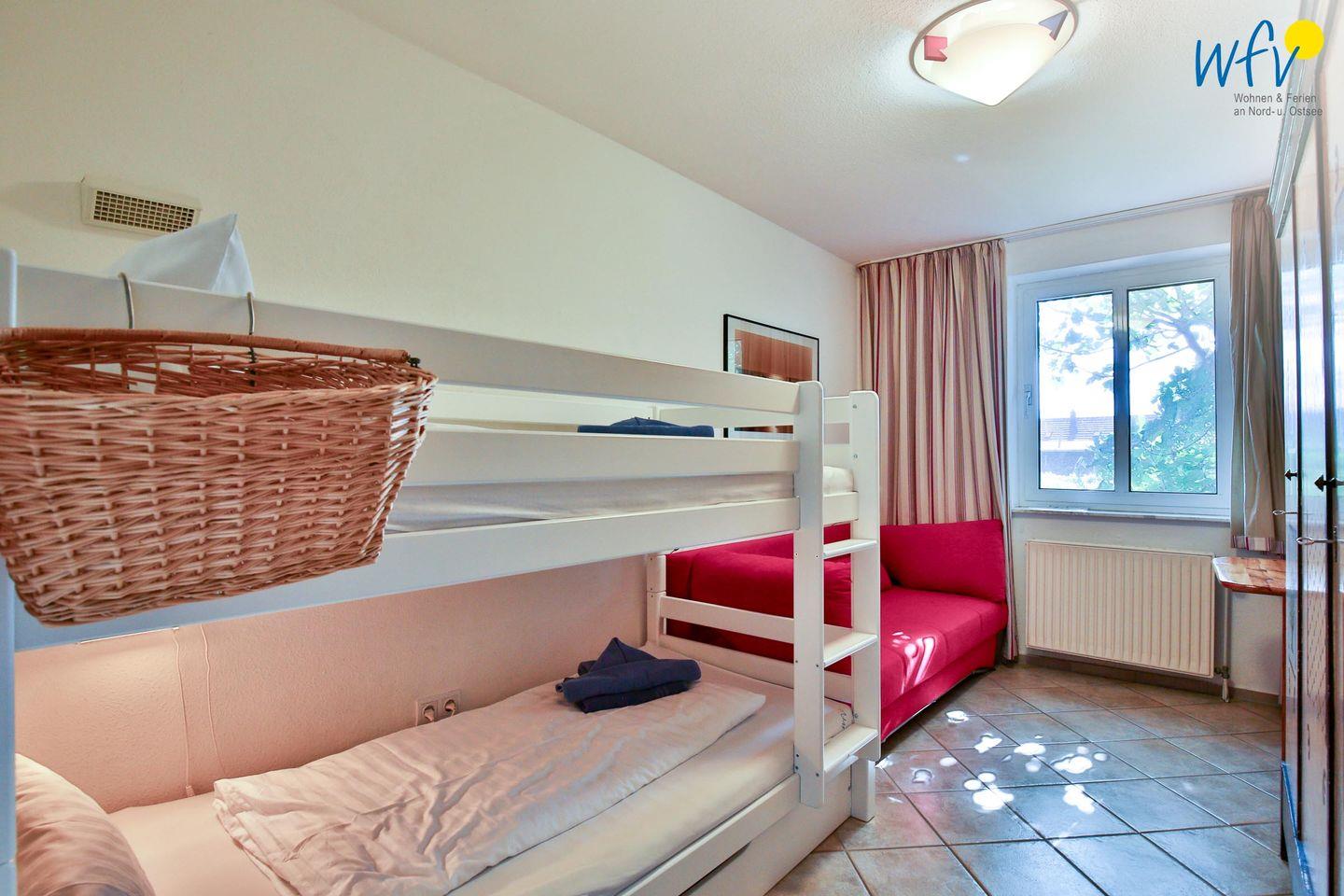 Durch sechs Schlafplätze haben Sie in der Ferienwohnung wunderbare Rückzugsmöglichkeiten. Die zwei separaten Schlafzimmer sind mit einem Doppelbett bzw. einem Etagenbett (mit optionalem Rausfallschutz) und einem Schlafsofa (160 cm breit) ausgestattet. Wahlweise steht außerdem ein Schlafsofa (160 cm breit) im Wohnbereich zur Verfügung.