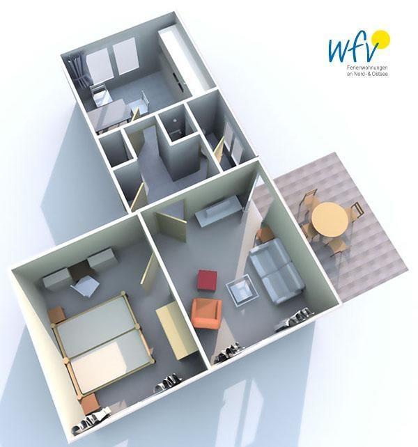 Moderne Ferienwohnung Seehund auf Wangerooge mit Terrasse und Strandkorb, nur 120 m vom Strand entfernt, inklusive WLAN und haustierfreundlich.