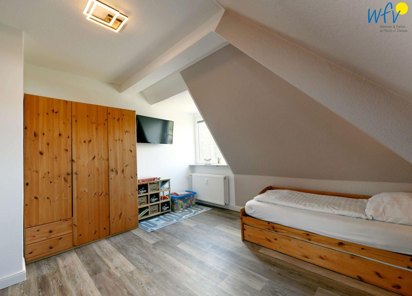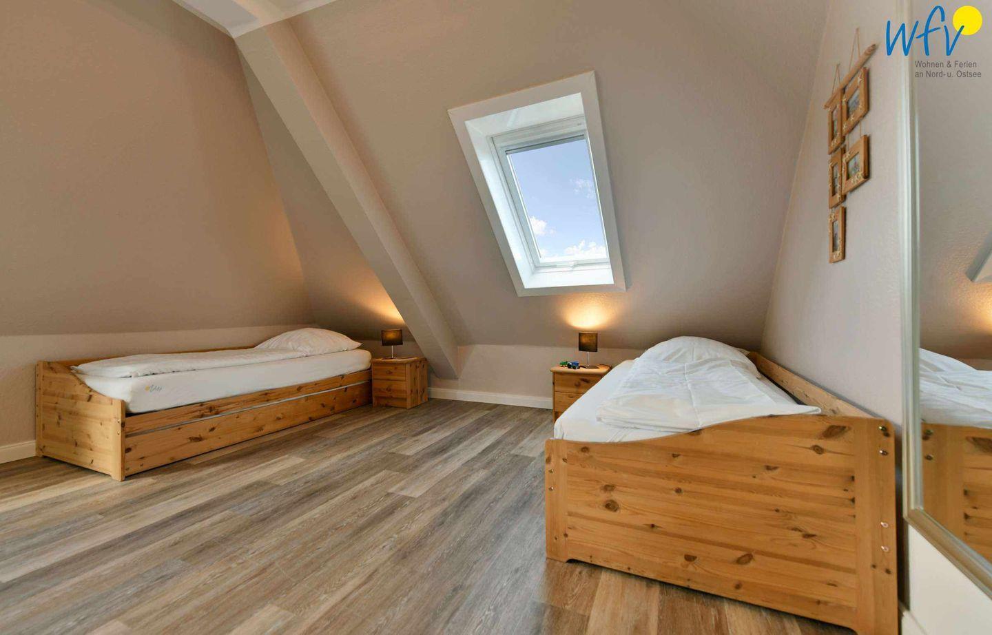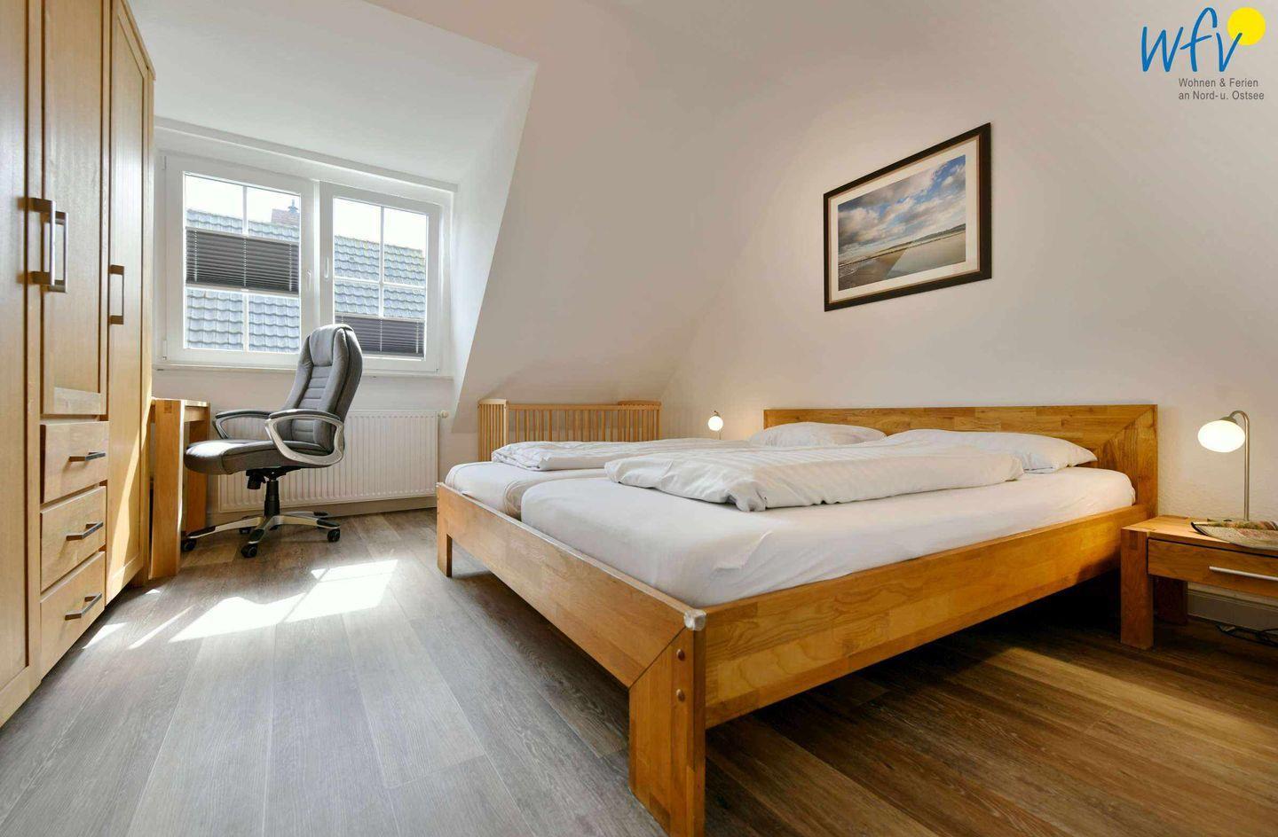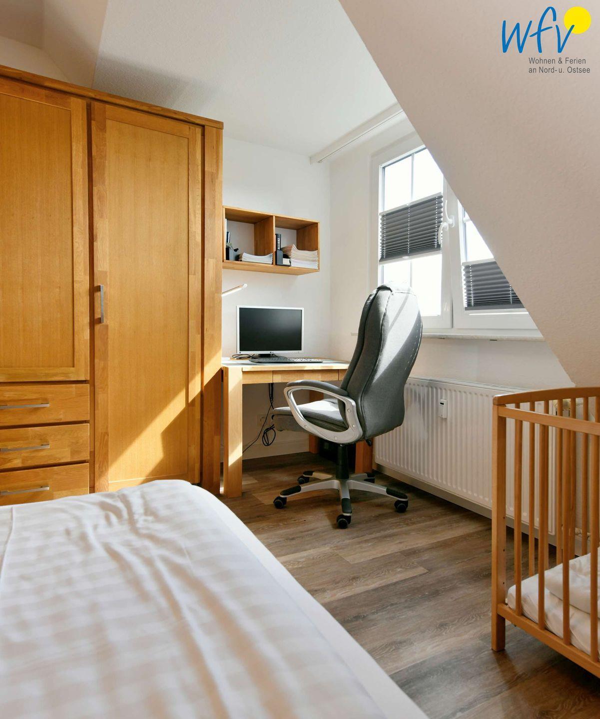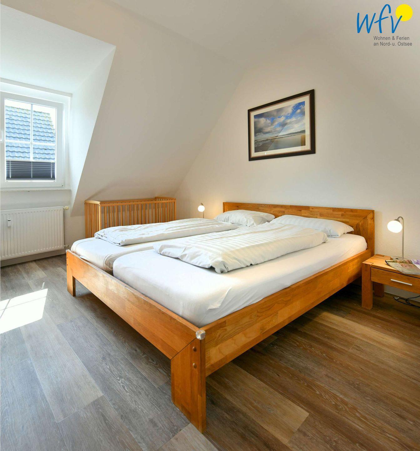Die zwei separaten Schlafzimmer der Ferienwohnung verfügen über eine optimale Bettenaufteilung. Ein Schlafzimmer ist mit einem Doppelbett und einem Kinderbett ausgestattet; das zweite Schlafzimmer mit zwei Einzelbetten, von denen eines einen Tandemauszug besitzt, sodass hier insgesamt drei Erwachsene bequem schlafen können.