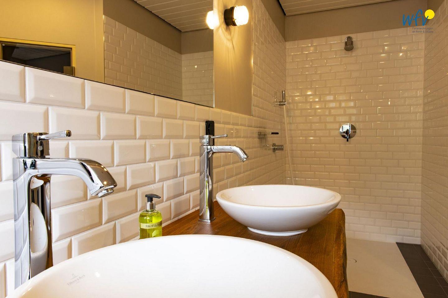 Auch in den zwei Badezimmern erwartet Sie eine verwöhnende Atmosphäre! Komplett gekachelte Wände im südländischen Stil sowie moderne Waschtische, hochwertige Armaturen und eine ebenerdige Dusche bzw. eine Sitzwanne verleihen den Räumen 100% - Wohlfühlfaktor!