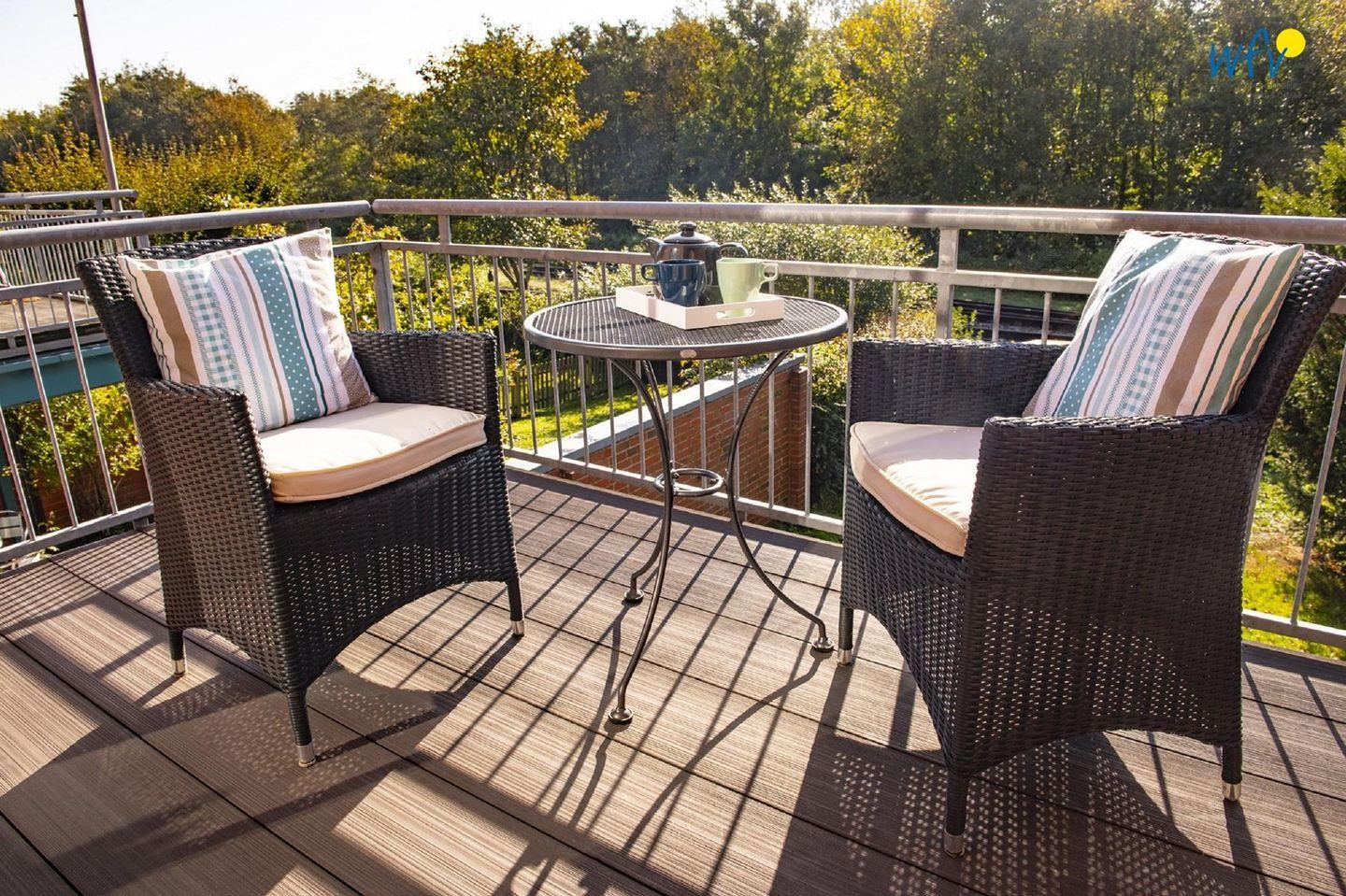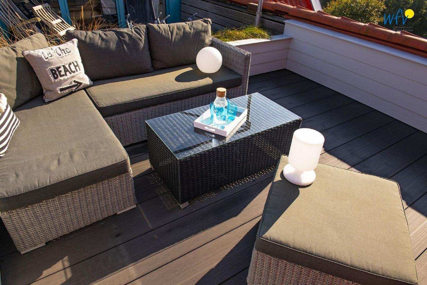 Sonnenbäder buchen Sie im "Haus im Süden" inklusive! Herrlich relaxen können Sie zum Beispiel auf der Dachterrasse mit gemütlichem Lounge-Sofa! Auf dem möblierten Balkon in der ersten Etage genießen Sie einen wunderschönen Blick ins Grüne. Und auf der Terrasse mit Strandkorb, hochwertiger Markise, Rattan-Sitzgruppe und Gasgrill lassen sich unvergessliche Urlaubs-Abende mit der ganzen Familie verbringen. An die Terrasse schließt sich ein Garten in Richtung Süden an.