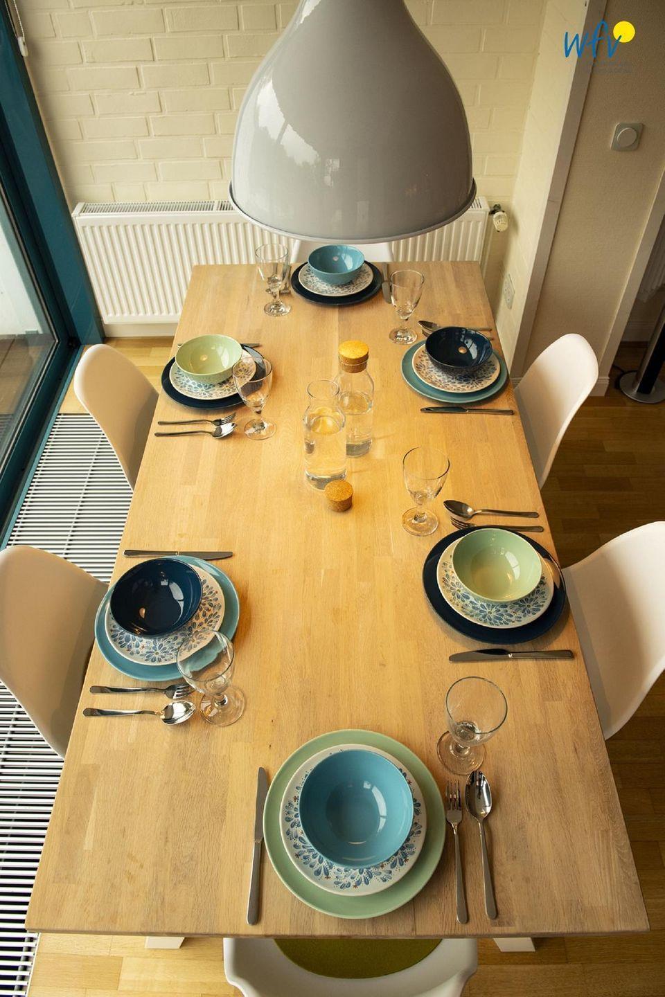 Auch in dem lichtdurchfluteten Wohnraum mit gemütlicher Sofaecke und großem Esstisch können Sie rundum entspannen! Ein moderner Flachbildfernseher mit Kabel-TV, Netflix und Sky steht Ihnen hier zur Verfügung - selbstverständlich kostenlos. In der gesamten Ferienwohnung empfangen Sie außerdem freies Wlan.