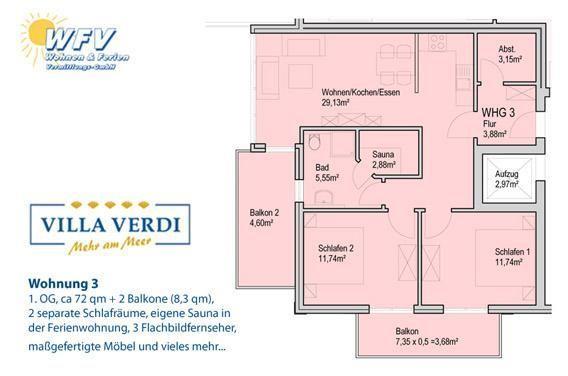 Genießen Sie Luxus und Komfort in einer 72 m² großen Suite mit Sauna und zwei Balkonen auf Wangerooge.