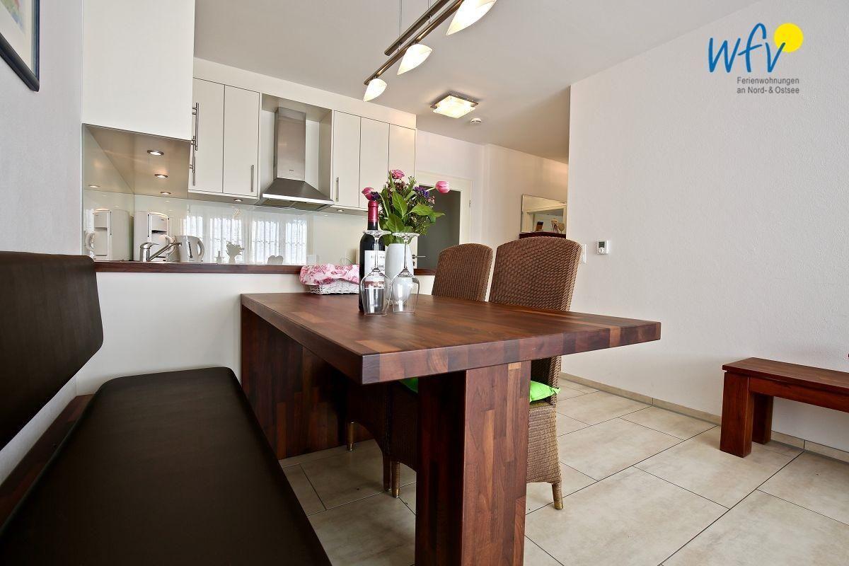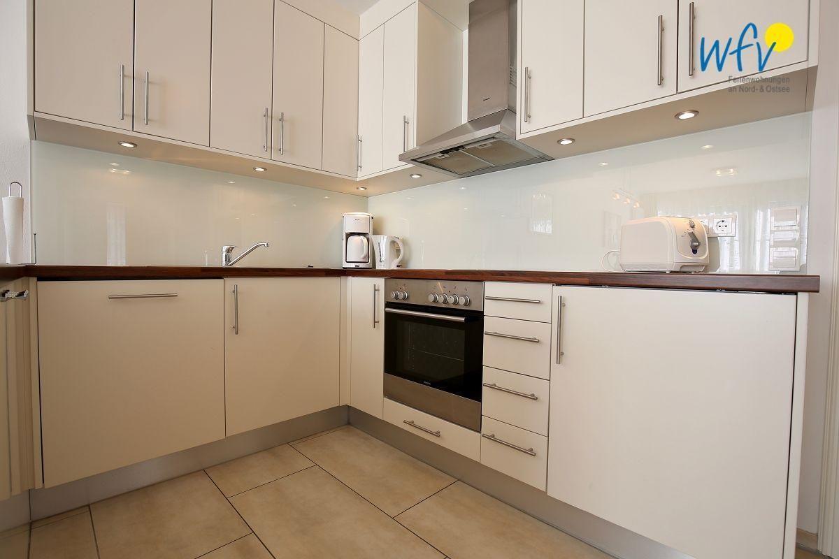 Durch die moderne Küche können Sie sich in Ihrem Urlaub auf Wangerooge bequem selbst verpflegen. Während im Backofen die Ofenkartoffeln bräunen, brutzelt in der Pfanne der frische Nordseefisch. Den Abwasch übernimmt selbstverständlich die Spülmaschine.