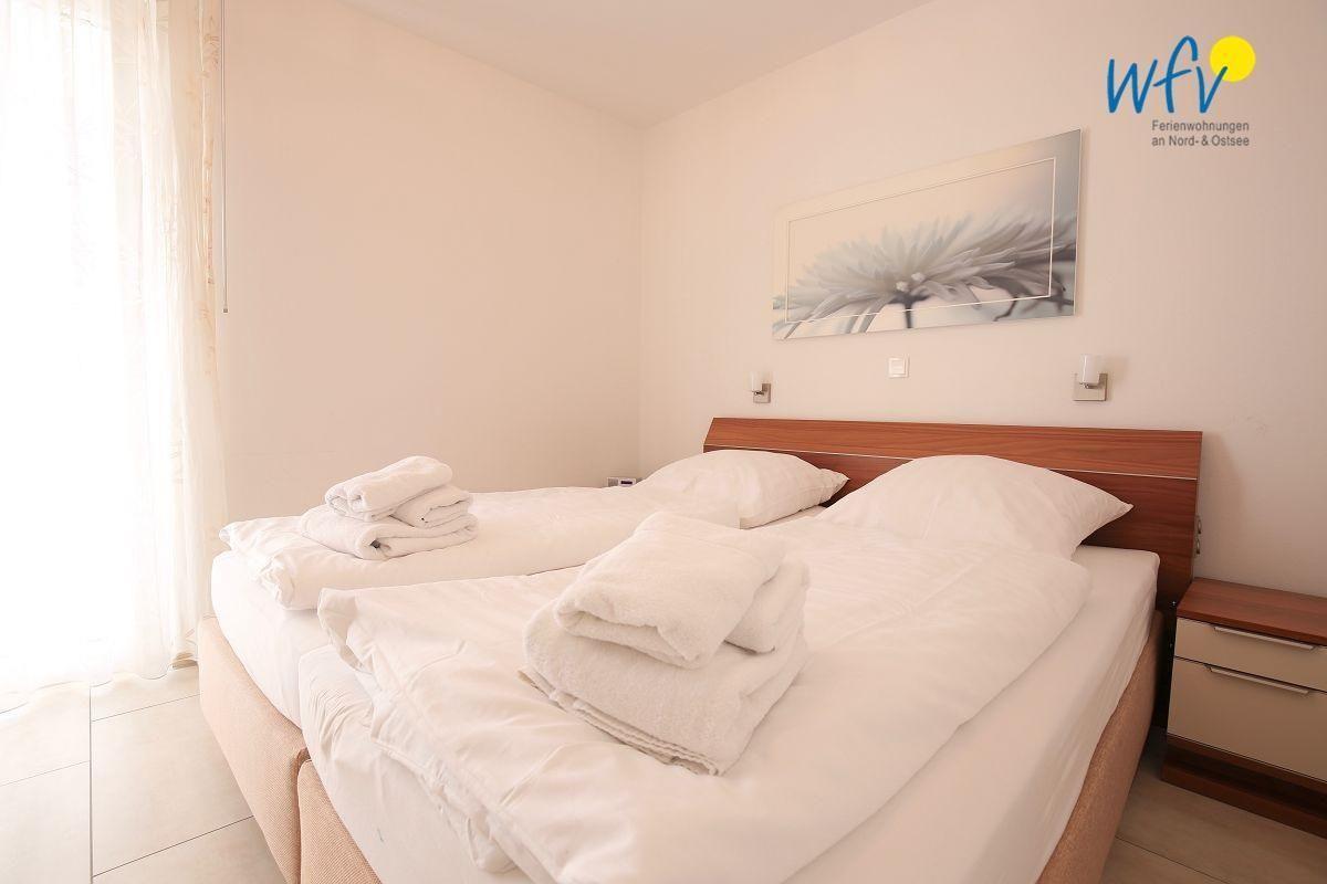 Die zwei separaten Schlafzimmer laden mit gemütlichen Betten zum erholsamen Ausschlafen ein! Eines der Zimmer ist mit einem Doppelbett ausgestattet, das andere mit zwei Einzelbetten.
