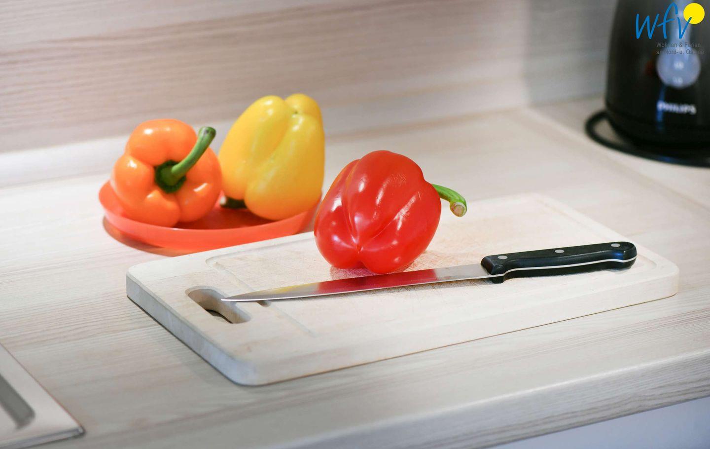 Die Küche ist komplett ausgestattet; neben dem normalen Essgeschirr gibt es Kinderbesteck und Geschirr für zwei Kinder. Für junge Familien ist ein Sterilisator für Kinderflaschen und ein Babykosterwärmer vorhanden.