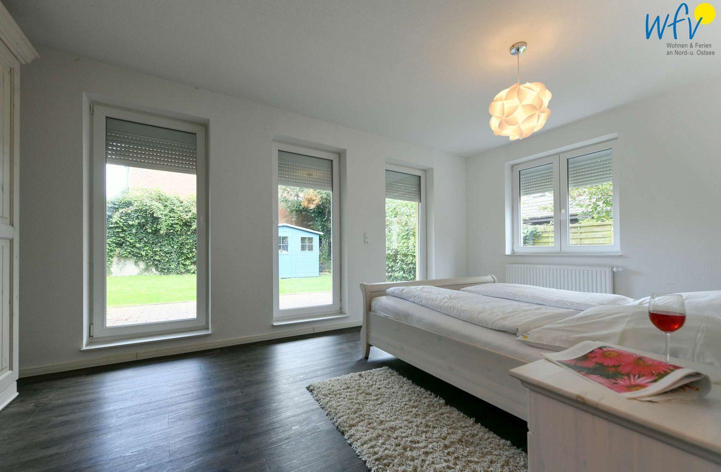 In dem separaten Elternschlafzimmer der Ferienwohnung auf Wangerooge befinden sich ein Doppelbett und ein großer Kleiderschrank. Das Kinderzimmer ist mit einem Kleiderschrank, zwei Einzelbetten sowie einem Kinderbett mit Matratze und Bettwäsche ausgestattet. Das Kinderbett steht Ihnen ohne Aufpreis zur Verfügung. Es ist auch als Laufstall nutzbar; die Einzelbetten können außerdem bei Bedarf mit einem Bettschutzgitter ausgerüstet werden. Sowohl das Elternschlafzimmer, als auch das Kinderzimmer verfügen über Jalousien.