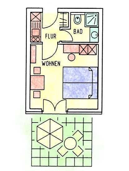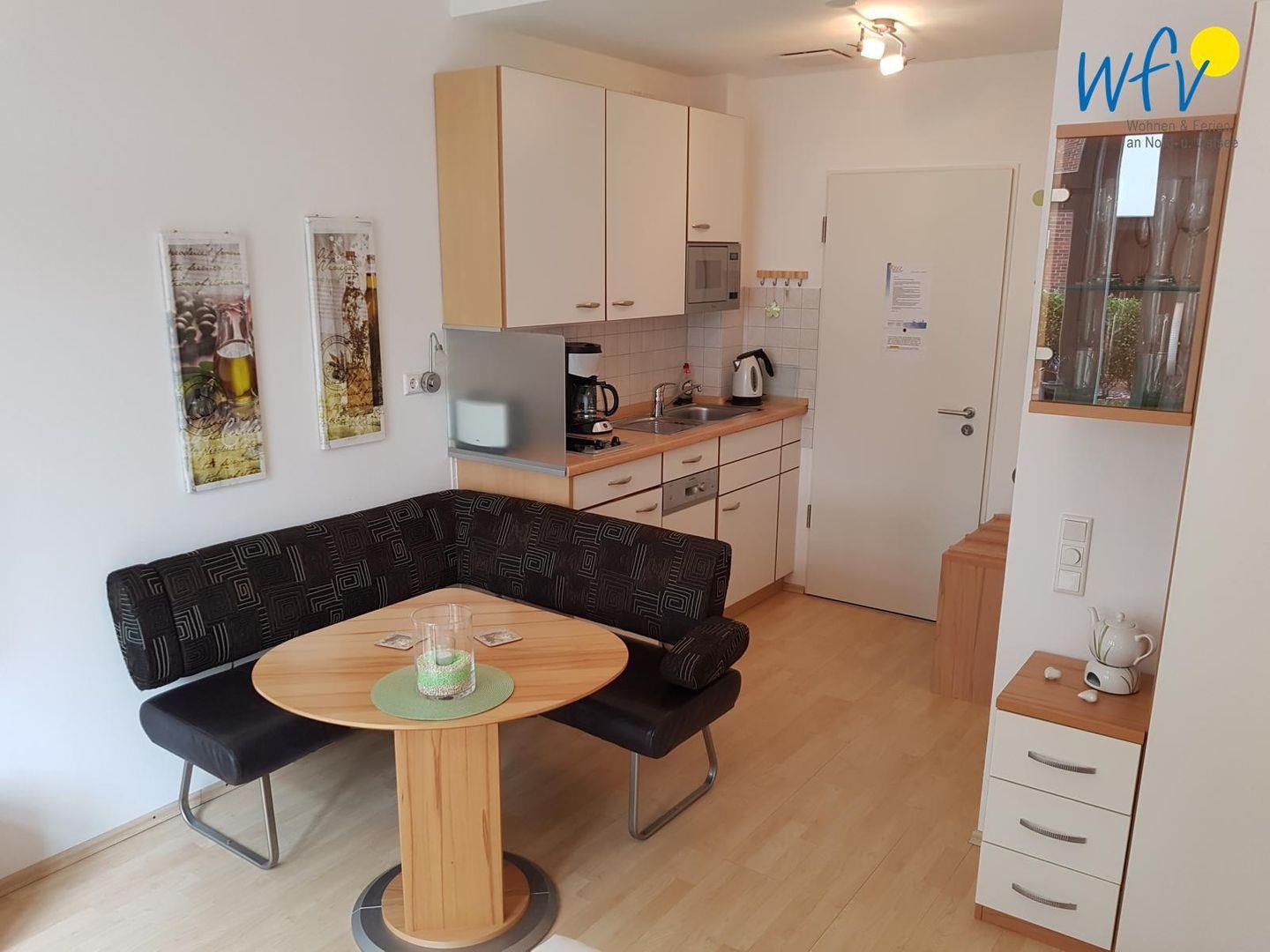 Eine optimale Raumaufteilung mit Schlafnische, Essecke und Küchenzeile macht die Ferienwohnung zu einem Wohlfühlort. Besonders die hübsch möblierte Terrasse wird Sie begeistern! Hier können Sie bei wohltuender Nordseeluft wunderbar im Strandkorb relaxen, ein spannendes Buch lesen oder den Abend bei einem guten Glas Wein ausklingen lassen.