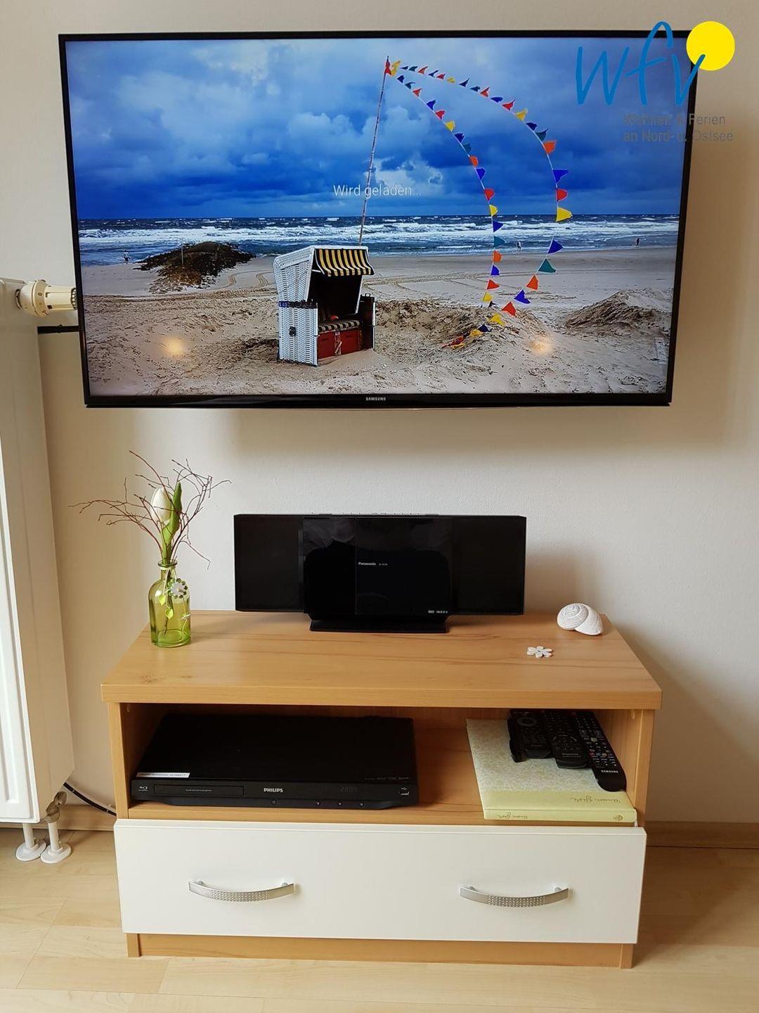 Ihre Urlaubsgarderobe findet Platz im geräumigen Kleiderschrank. Zur Unterhaltung stehen Ihnen ein modernes TV mit DVD- und Blu-ray-Player, eine kleine Stereo-Anlage und freies WLAN zur Verfügung.