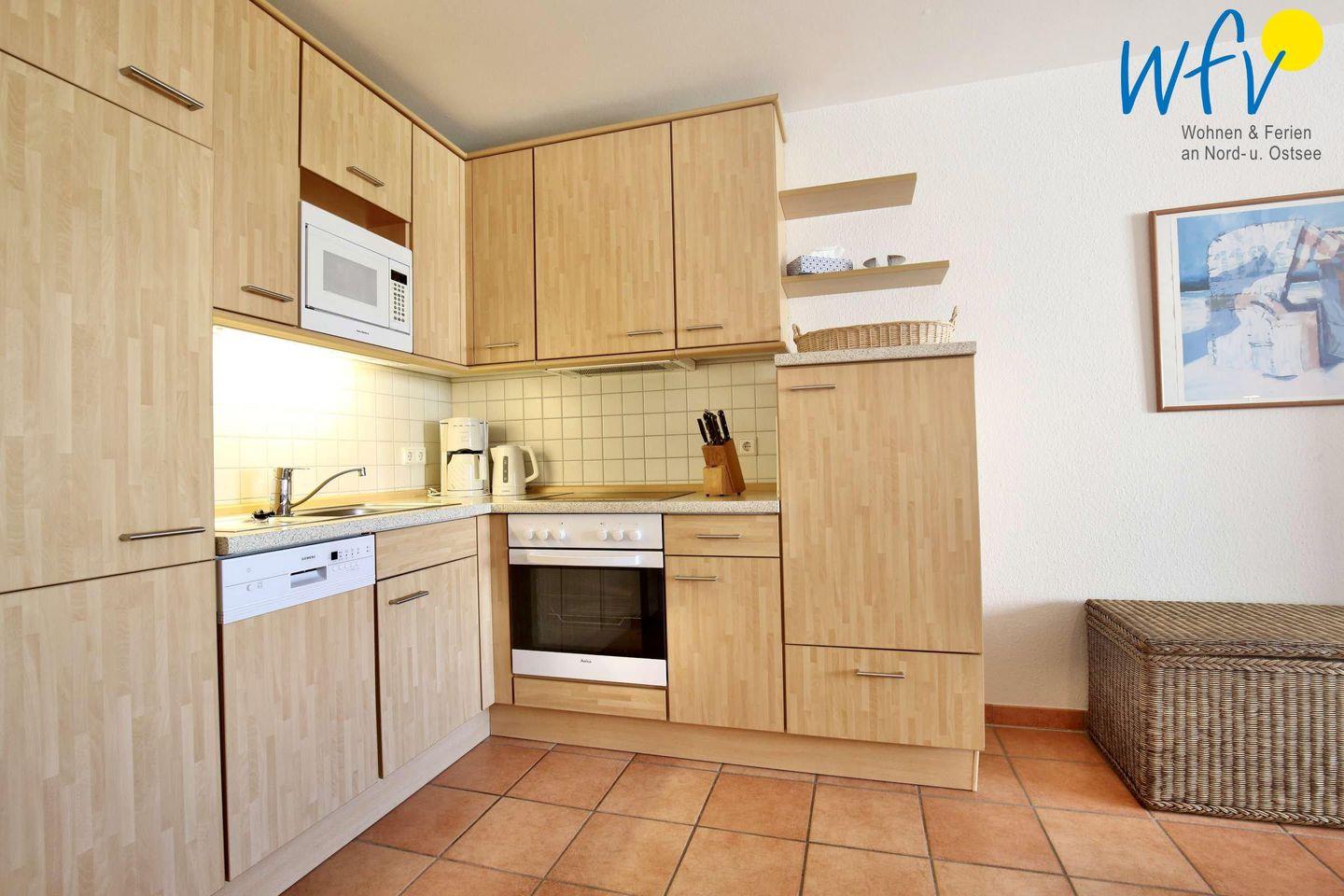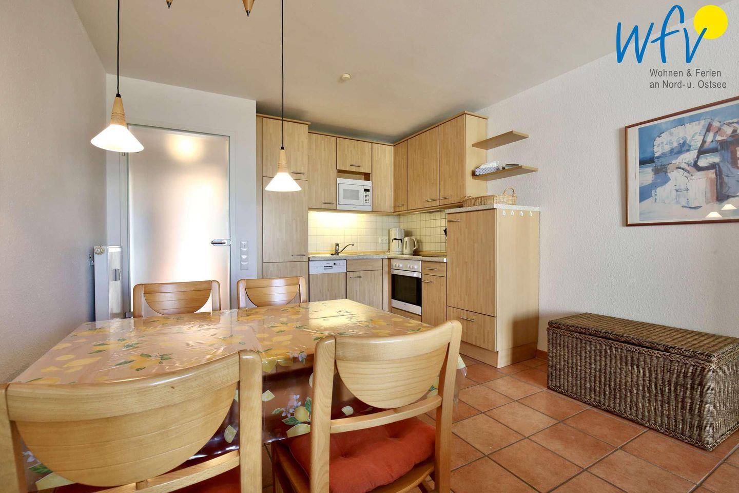 In der offenen Küche mit integriertem Essbereich lassen sich einfach und bequem leckere Gerichte zubereiten. Sie ist u.a. mit Geschirrspüler, Mikrowelle und Backofen mit Ceranfeld ausgestattet. Oder Sie lassen sich verwöhnen und speisen auf der tollen Meerblickterrasse des hauseigenen Restaurants "Krüsch"! Auf der Terrasse in direkter Promenaden- und Strandnähe genießen Sie herrliche Stunden mit Meeresbrise.