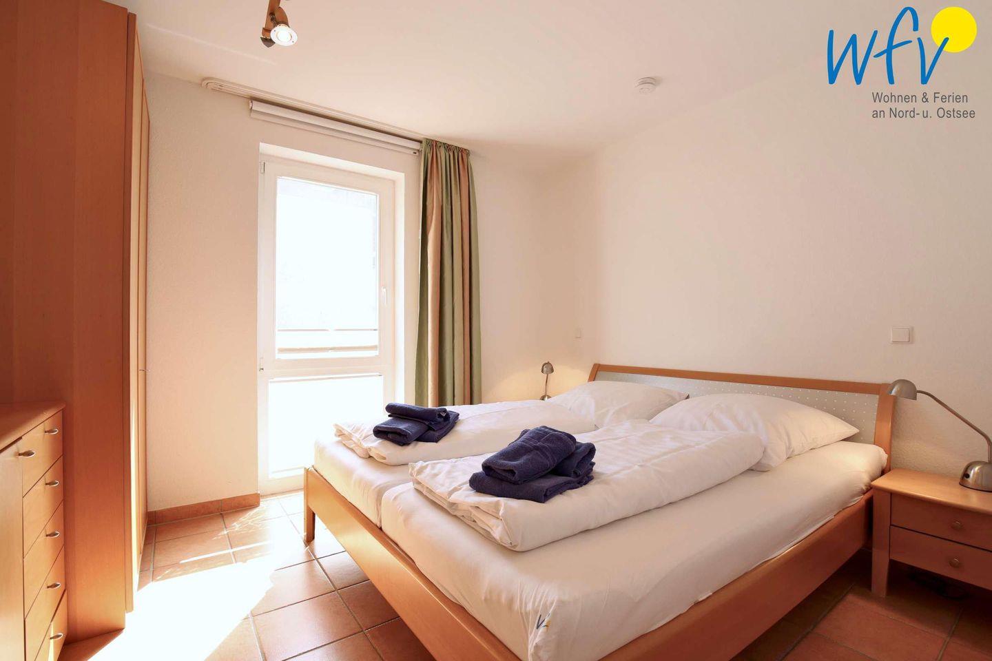 In dem separaten Schlafzimmer befinden sich ein komfortables Doppelbett und ein geräumiger Kleiderschrank. Zwei weitere Schlafmöglichkeiten bestehen durch das Schlafsofa im Wohnbereich.