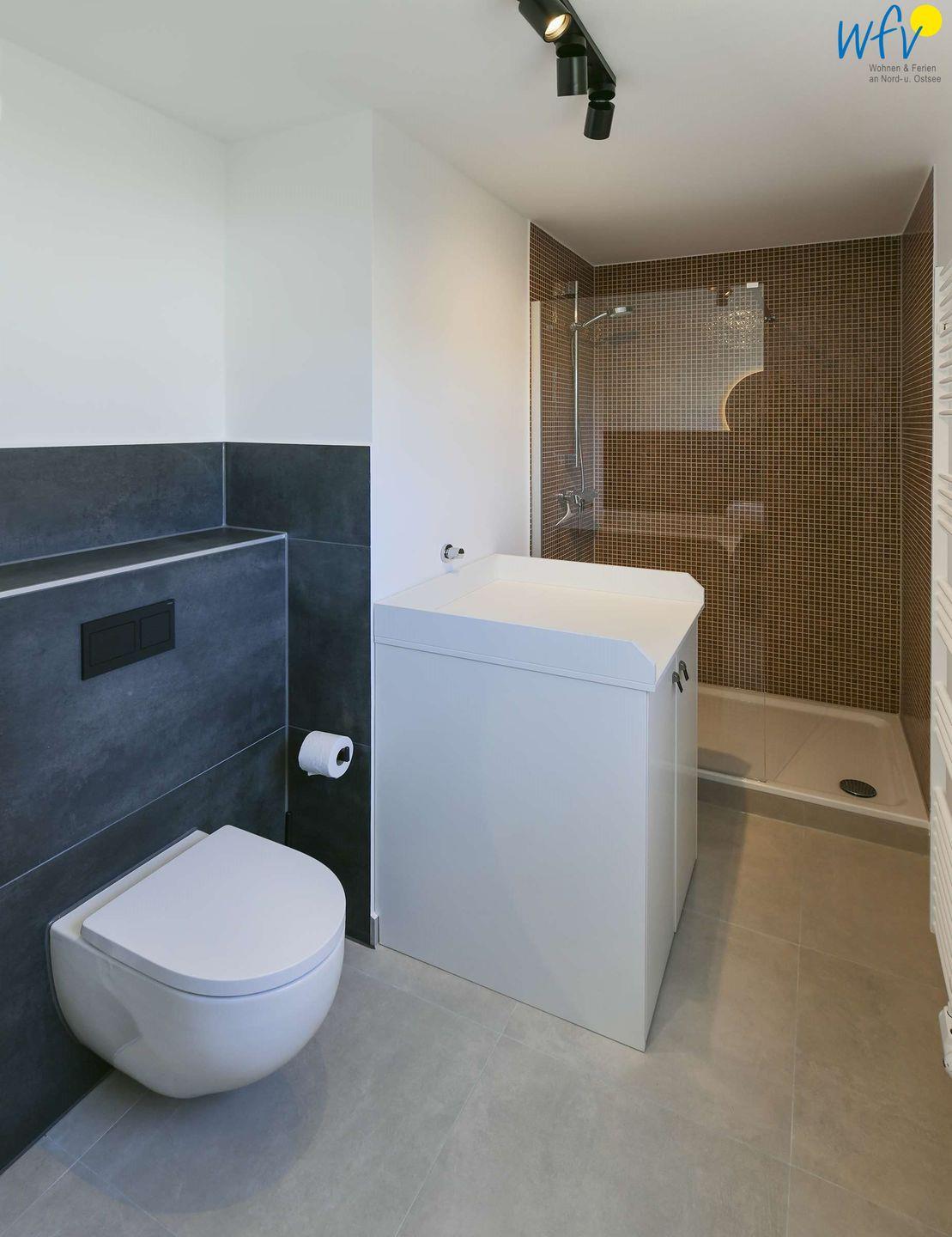 Ein weiteres Highlight ist das Badezimmer. Die große Dusche, der passgenaue Waschtisch und die fein abgestimmte Beleuchtung machen richtig Spaß. Eine Waschmaschine steht zur Verfügung.