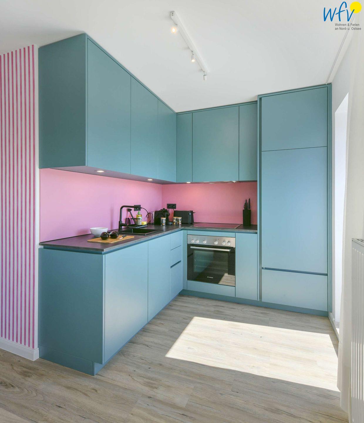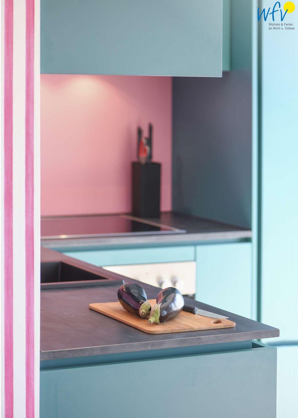 In dem hellen und offenen Wohnbereich mit stylischer Einbauküche, großem Esstisch mit eingebauter Sitzbank sowie Sofa und SmartTV lassen sich entspannte Urlaubstage verbringen.