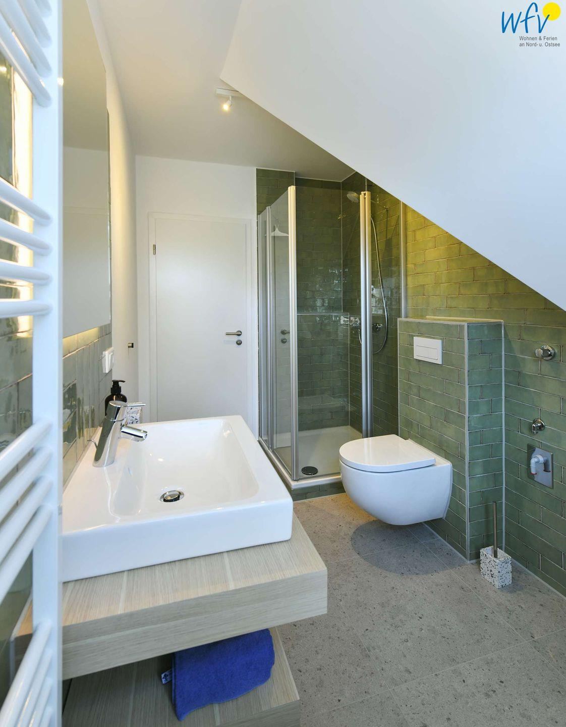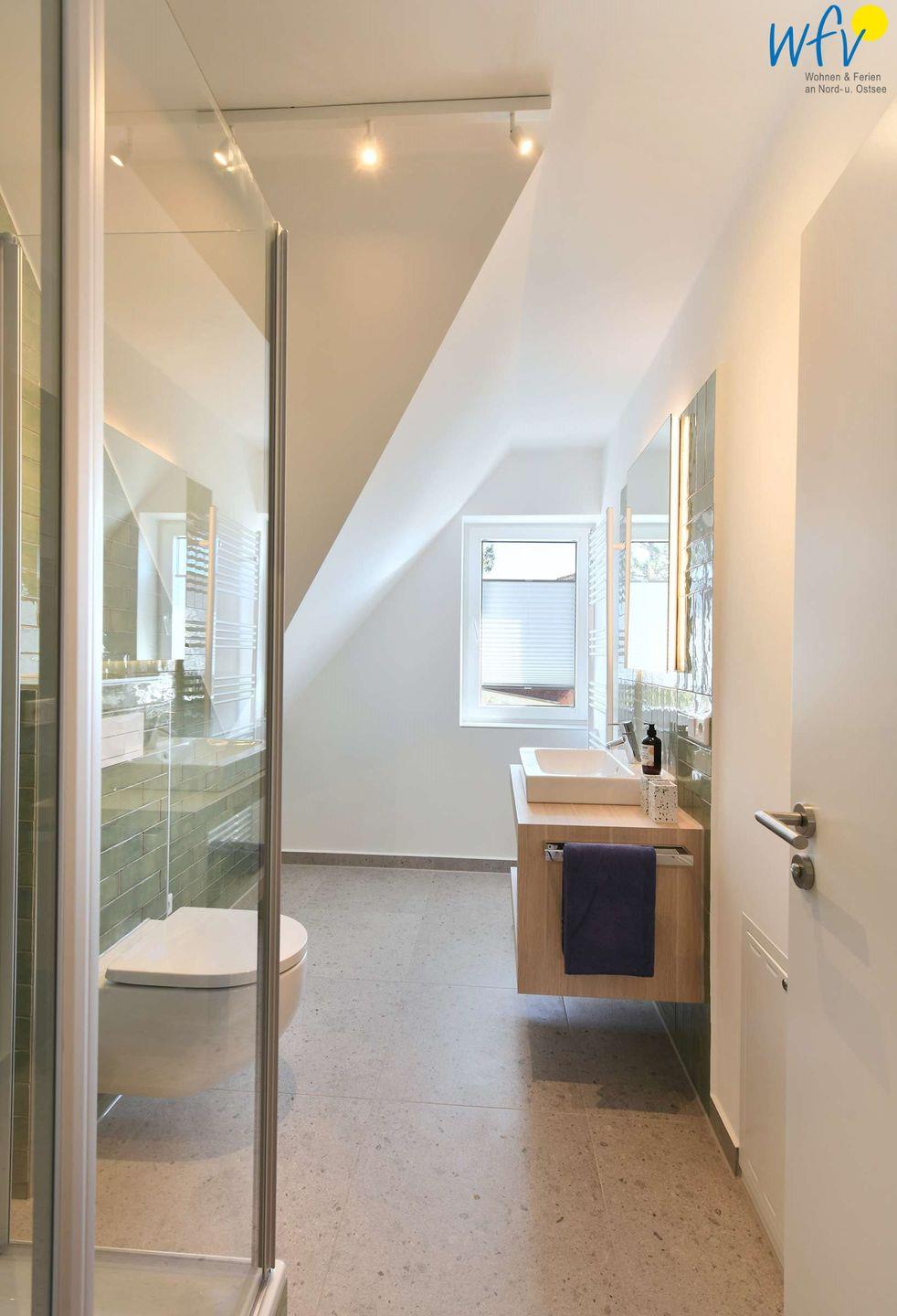 Weiteren Wohnkomfort bietet Ihnen das gepflegte Duschbad in exquisitem Design: Metrofliesen an der Wand, Bodenfliesen in Betonoptik, ein passgenauer Unterschrank vom Tischler und ein hinterleuchteter Spiegel machen auch diesen Raum zu einem Wohlfühlort. Eine Waschmaschine steht zur Verfügung.