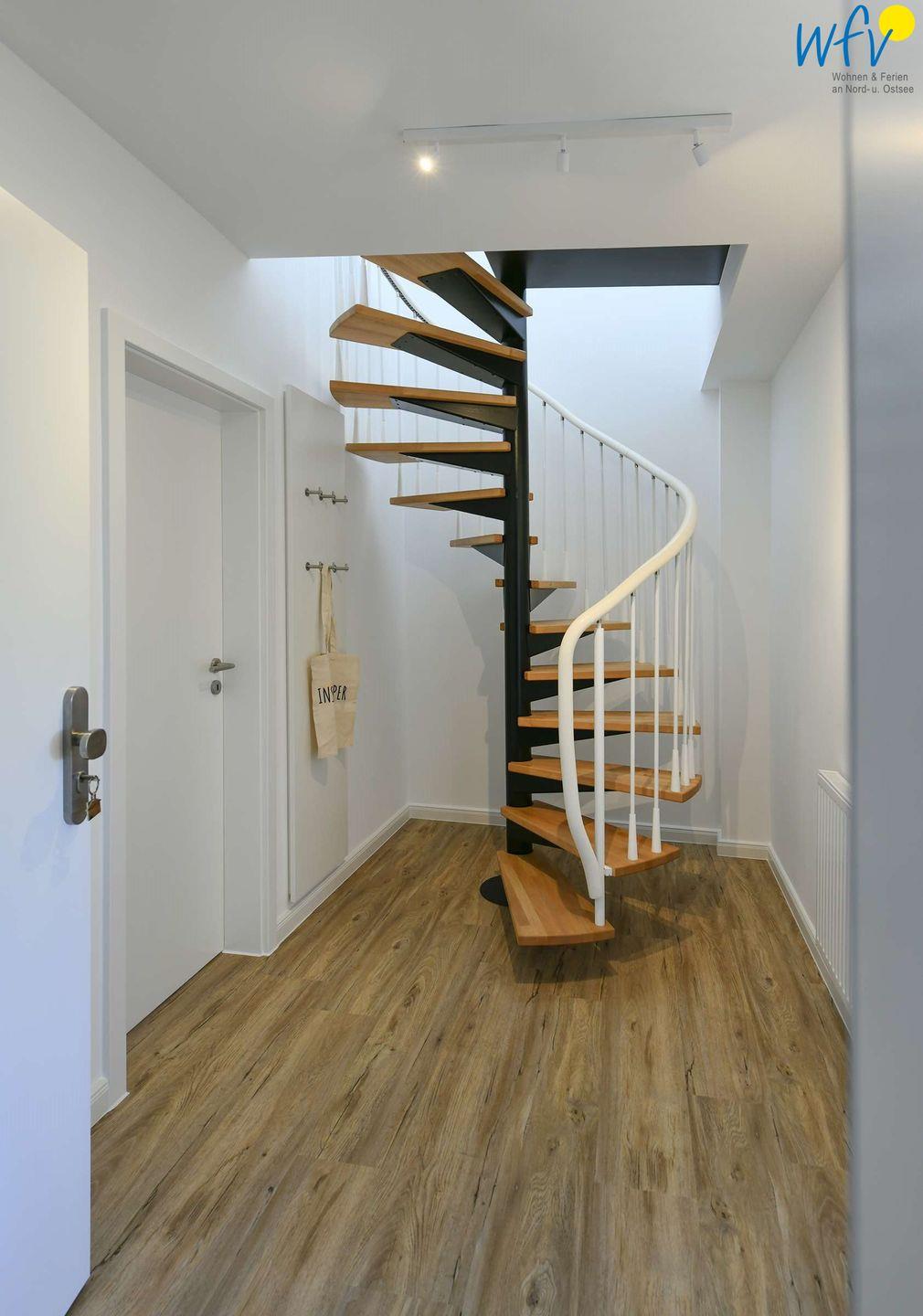 Über eine Wendeltreppe im Flur gelangen Sie auf die Galerie im Dachgeschoss. Hier befindet sich das zweite separate Schlafzimmer der Ferienwohnung auf Wangerooge. Dieses ist mit einem Doppelbett (1,40 m) und zwei Einzelbetten sowie einem weiteren SmartTV ausgestattet.