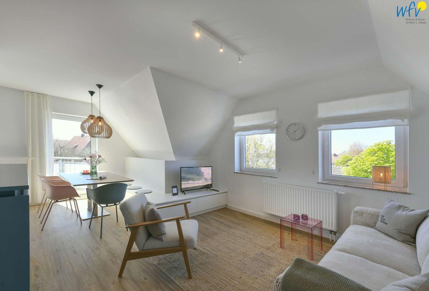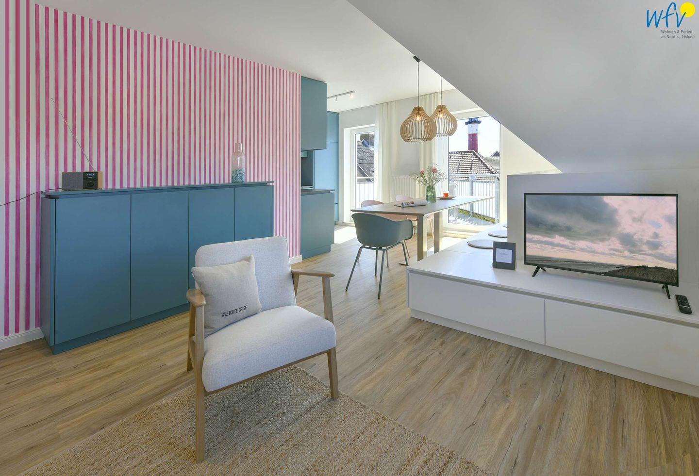 Exklusive Maisonette-Wohnung "Düne" auf Wangerooge mit Leuchtturmblick, Balkon und stilvollem Design für entspannte Urlaubstage.