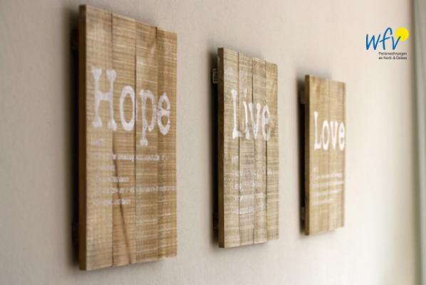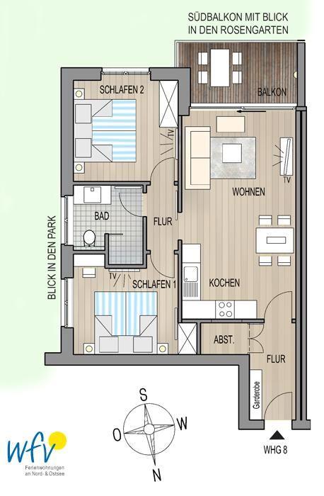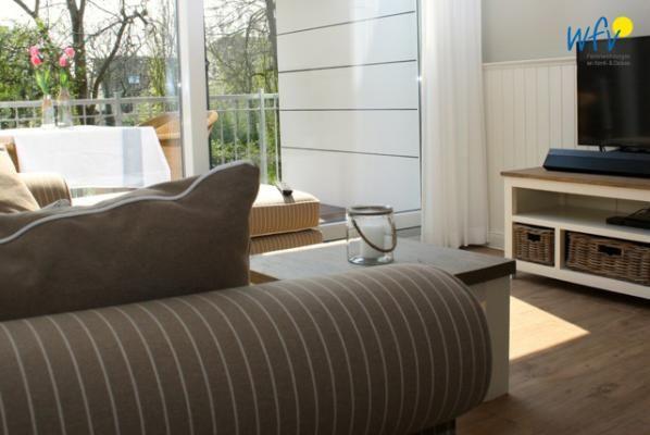 Die Wangerooger Ferienwohnung verfügt über eine hochwertige, geschmackvolle Ausstattung im modernen Landhausstil. Der helle und offene Wohnbereich sorgt mit großer Glasfront zum Süd-Balkon und Blick auf die idyllischen Grünanlagen des Rosengartens für ein außergewöhnliches Ambiente.