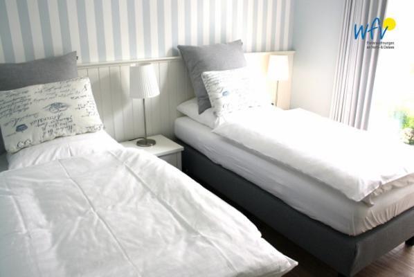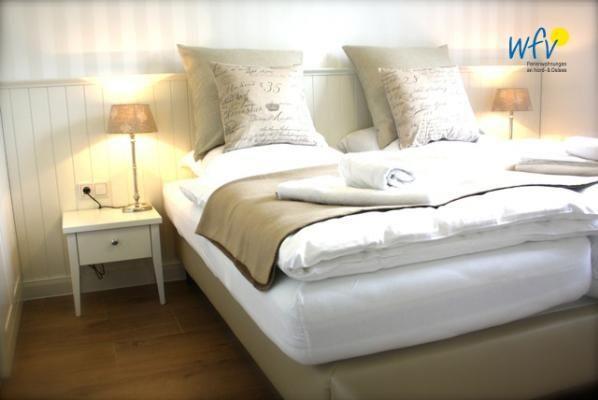 Die zwei separaten gemütlichen Schlafzimmer der Ferienwohnung verfügen über komfortable Boxspringbetten (1 Doppelbett und 2 Einzelbetten) sowie Flatscreens.
