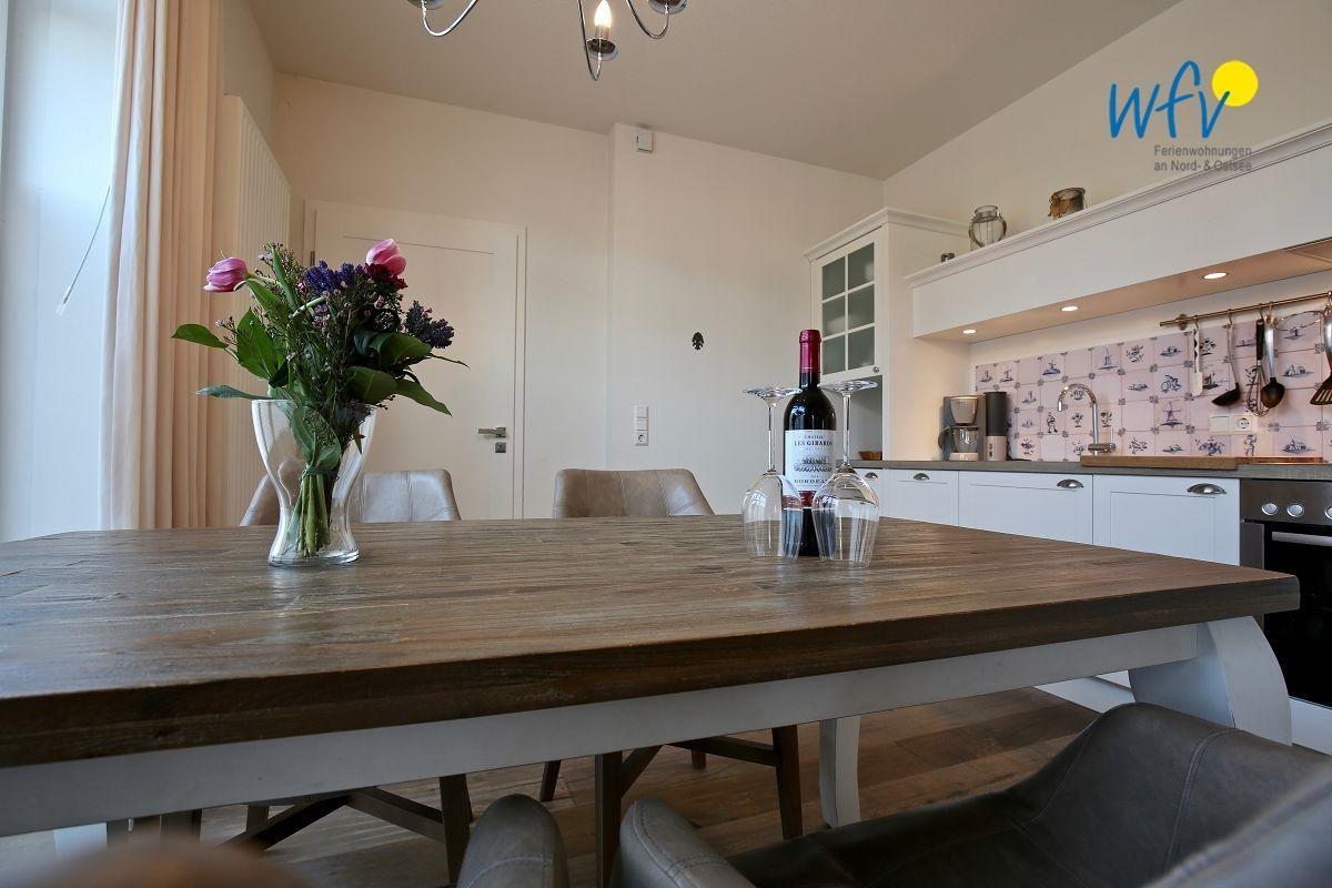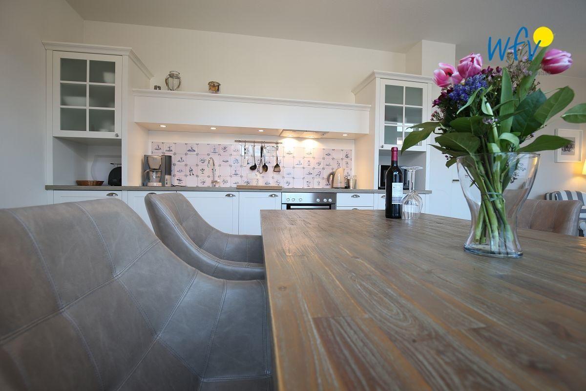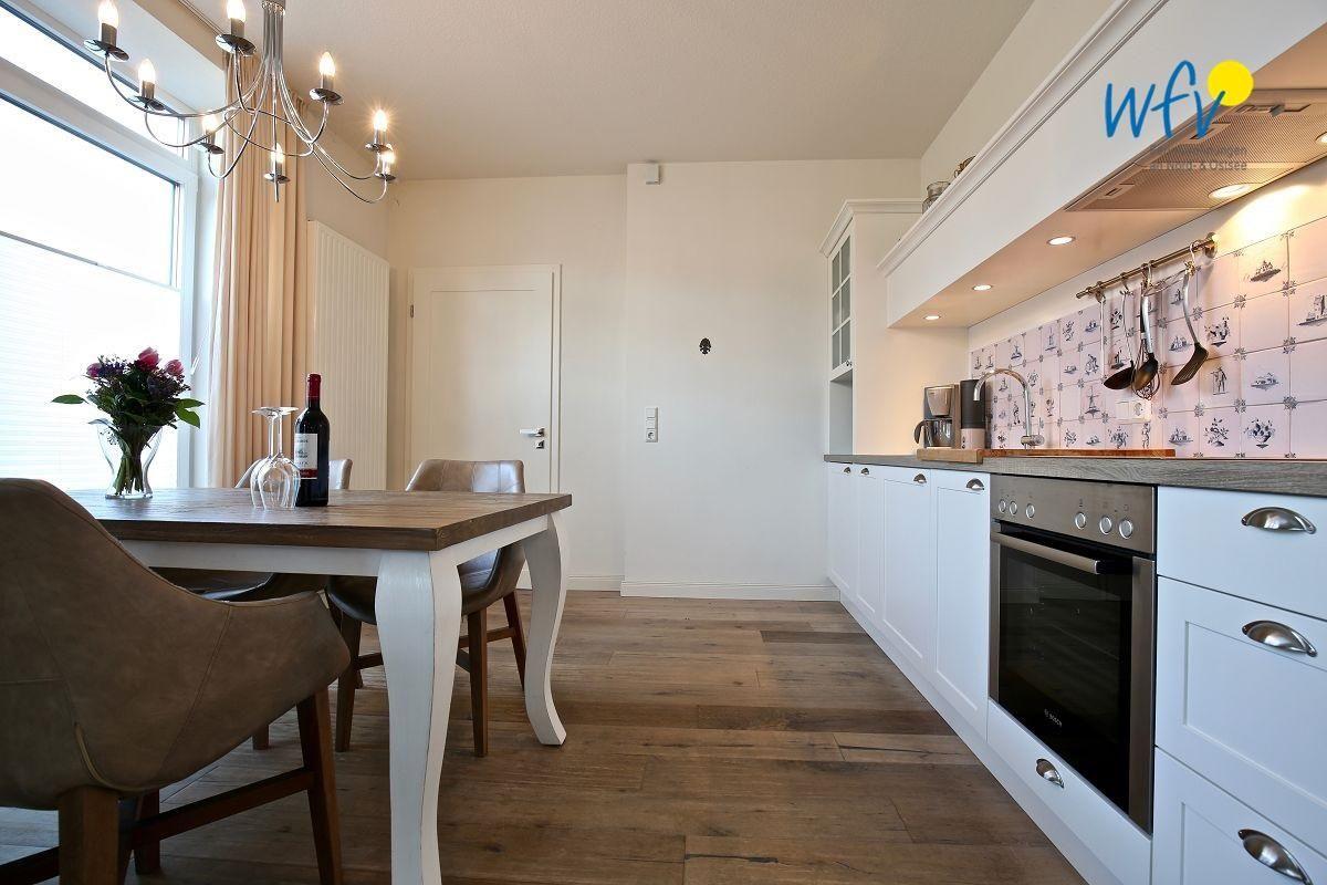 Leckere Mahlzeiten können Sie in der sehr gut ausgestatteten Einbauküche der Ferienwohnung zaubern! Sie ist u.a. mit Herd, Backofen, Mikrowelle und kleiner Spülmaschine sowie Kaffeemaschine, Wasserkocher und Toaster ausgestattet. Der wunderschöne Essplatz am Fenster macht bereits beim Frühstück Lust, den neuen Urlaubstag auf Wangerooge zu planen.