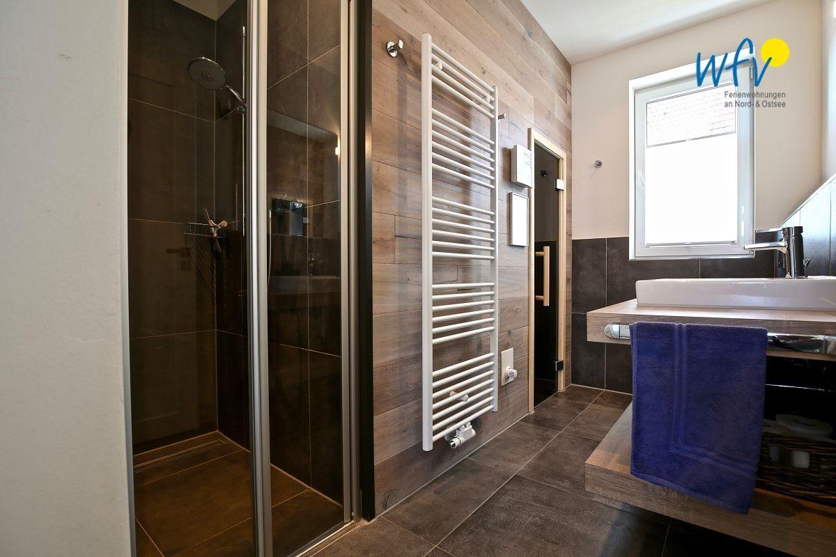 Nach dem Strandspaziergang an der Nordsee sind Ihnen wohltuende Relaxmomente in unserer Ferienwohnung garantiert! Das moderne Bad verwöhnt Sie mit einer eigenen Sauna, einer bodengleichen Dusche und einem Handtuchheizkörper. Ein Fön gehört zum festen Inventar.