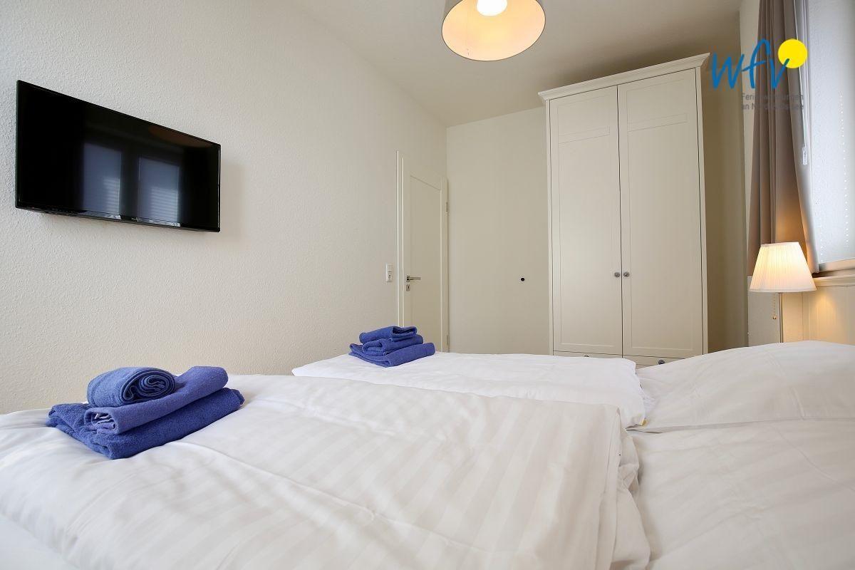 Sie träumen vom ausgiebigen Ausschlafen in Ihren Ferien? In den zwei separaten Schlafzimmern warten komfortable Boxspringbetten auf Sie! Sogar mit Flat-TV zum Einschlafen. Für die Urlaubsgarderobe ist jede Menge Platz im Kleiderschrank.