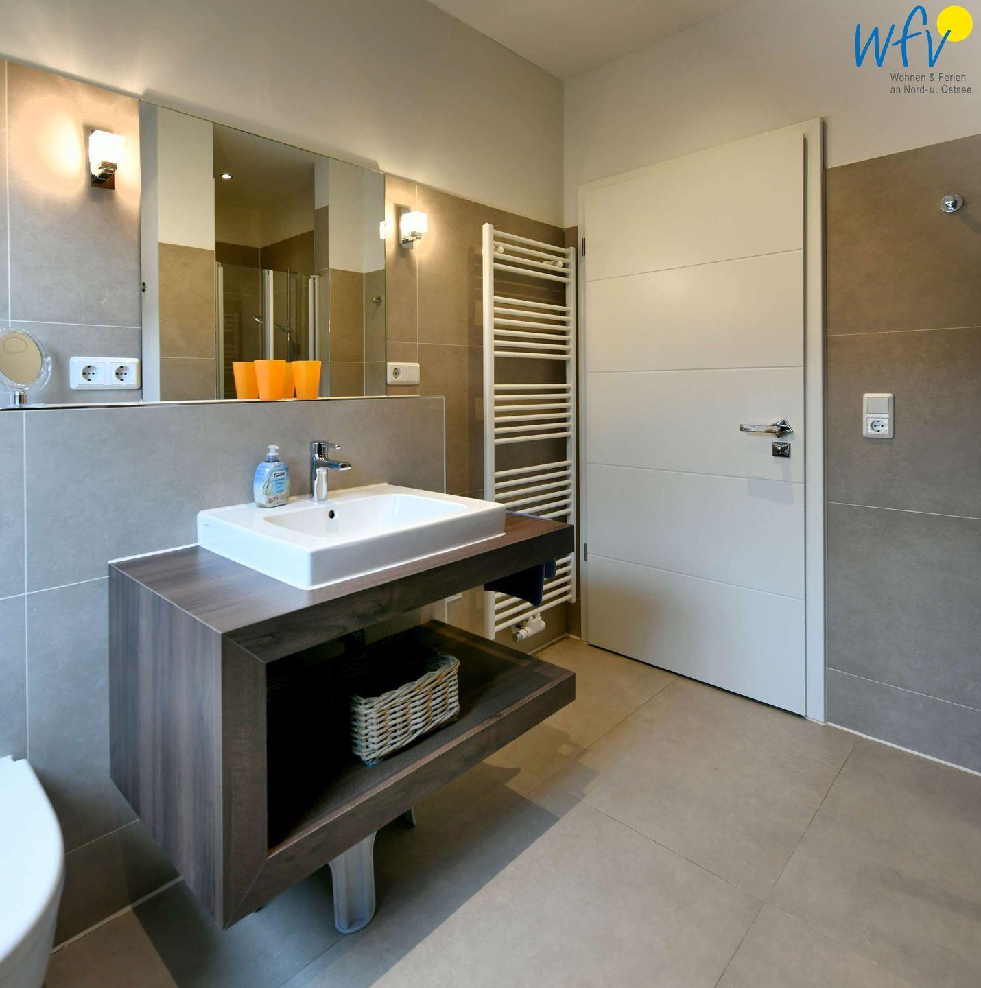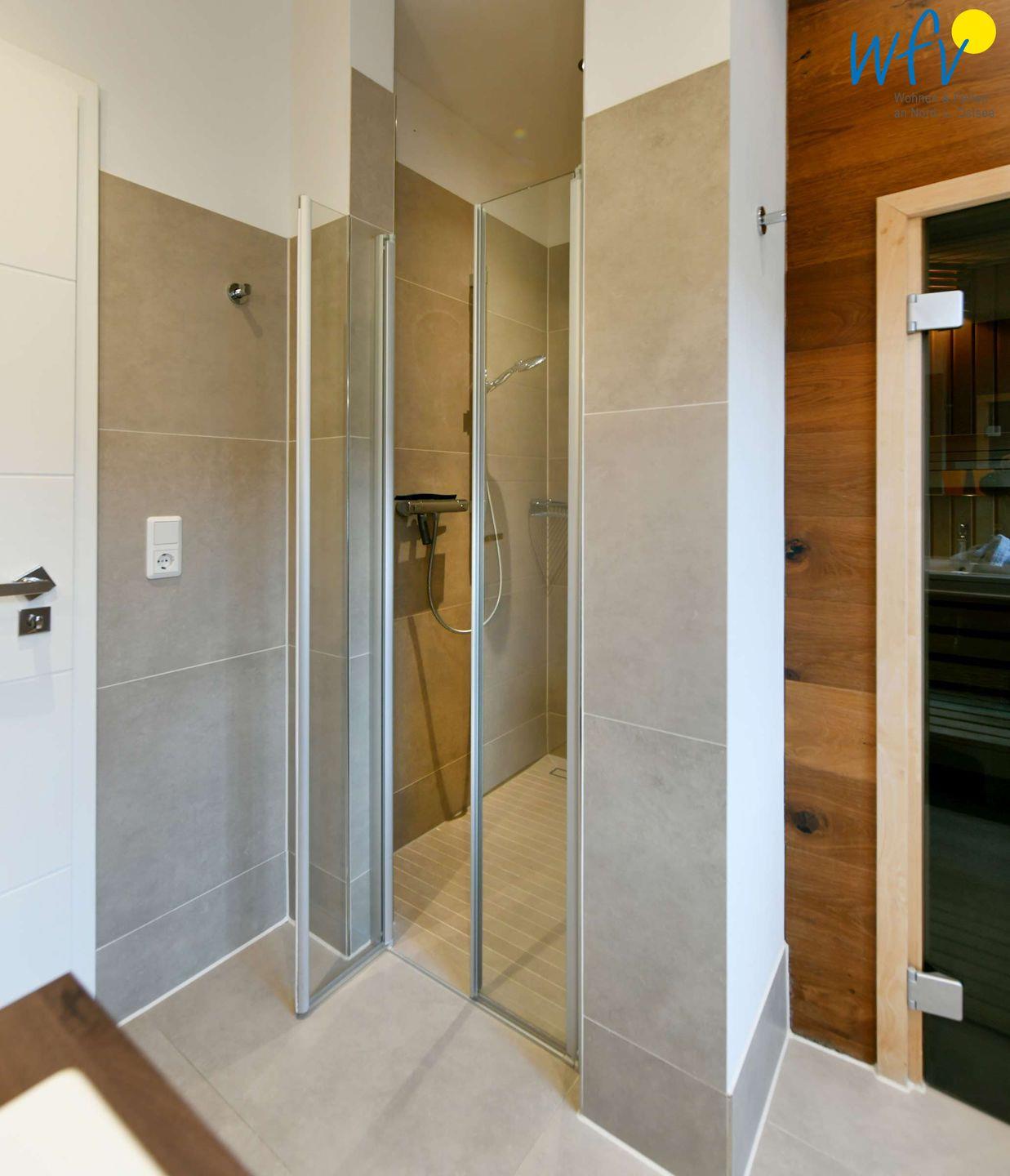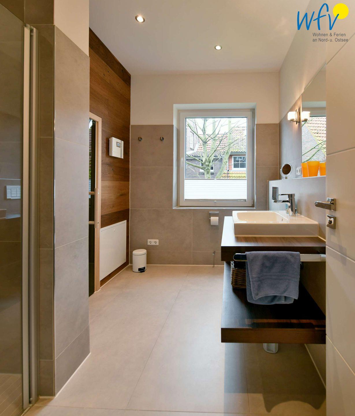 Das moderne Badezimmer mit eigener Sauna, bodengleicher Dusche und Handtuchheizkörper macht den Urlaub einmalig! Nach dem Strandspaziergang sind hier wohltuende Verwöhnmomente garantiert!