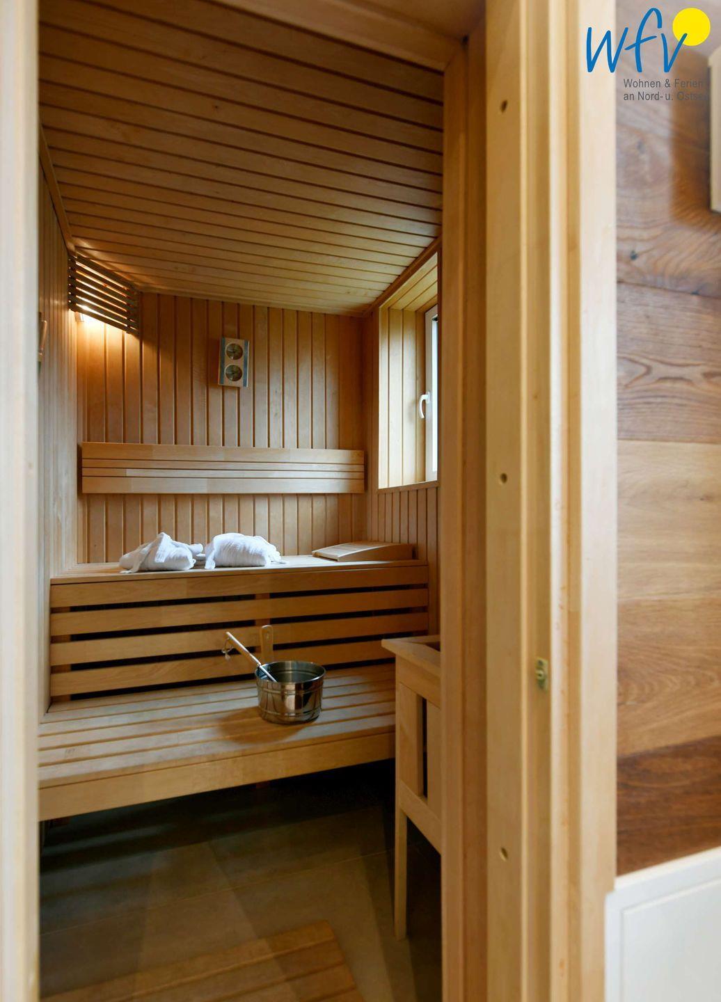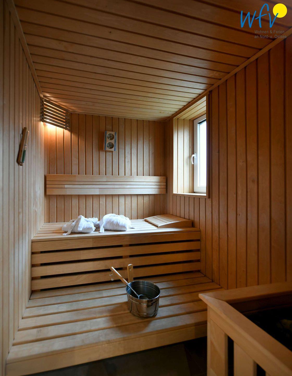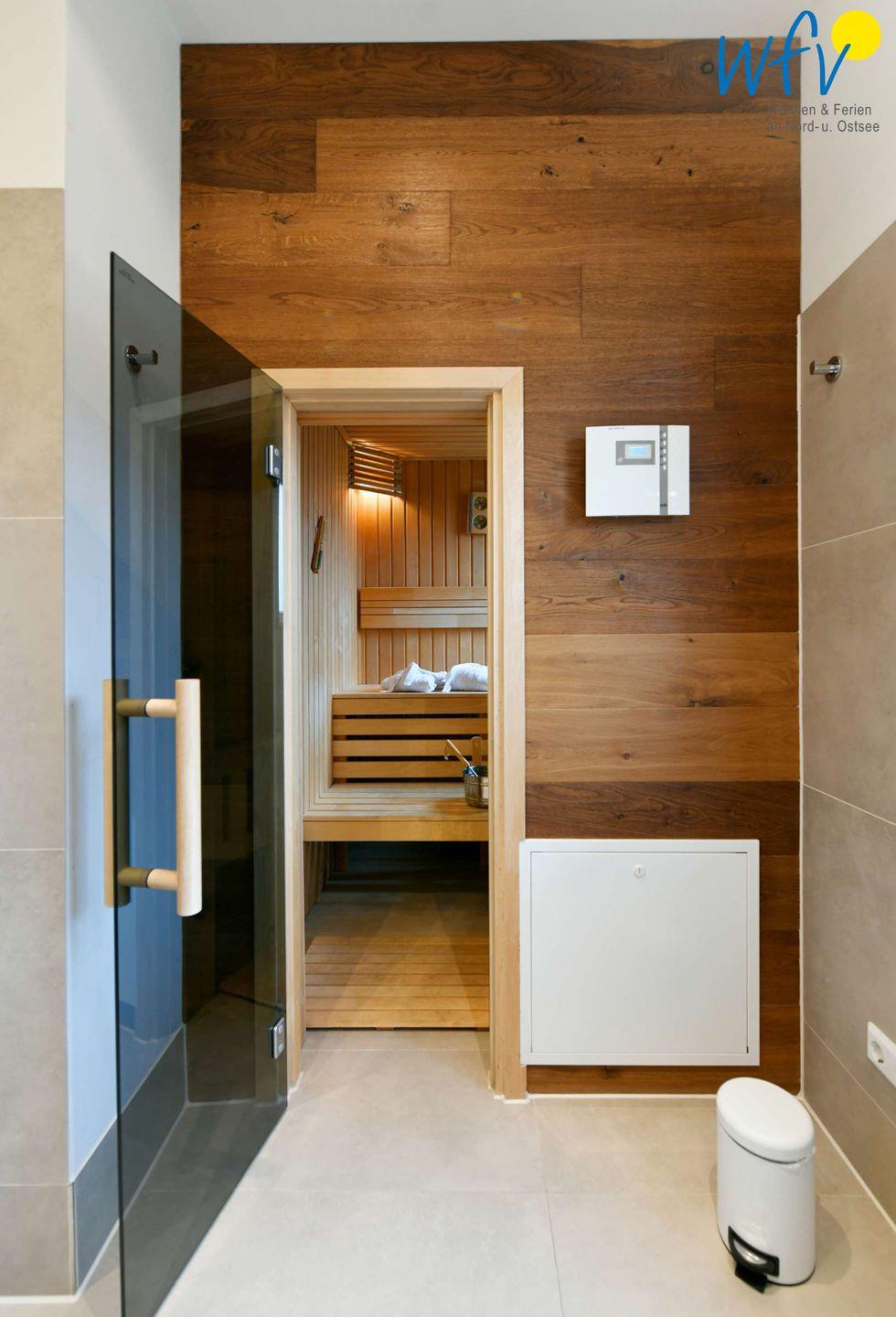 Das moderne Badezimmer mit eigener Sauna, bodengleicher Dusche und Handtuchheizkörper macht den Urlaub einmalig! Nach dem Strandspaziergang sind hier wohltuende Verwöhnmomente garantiert!
