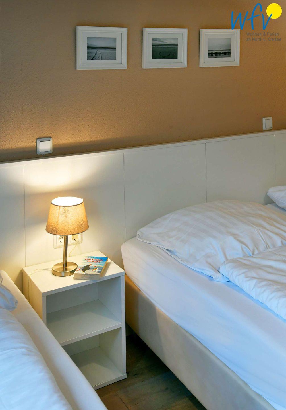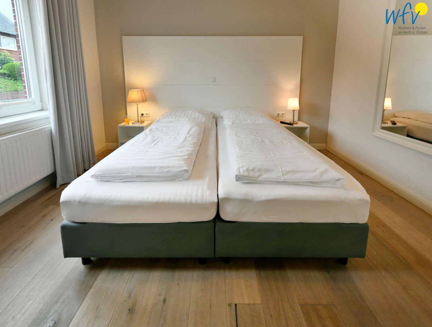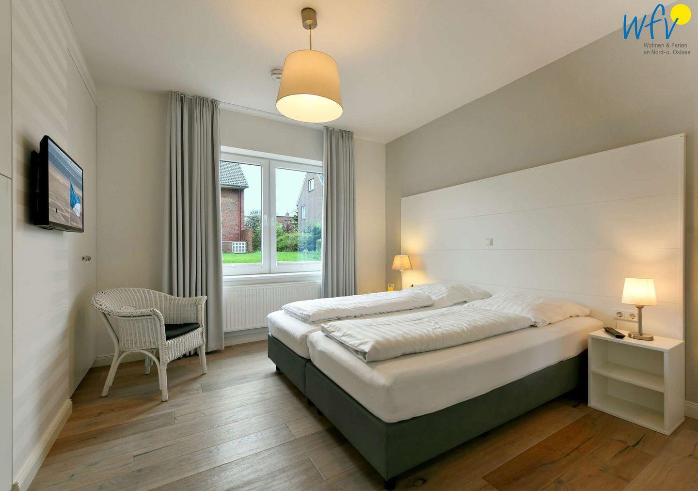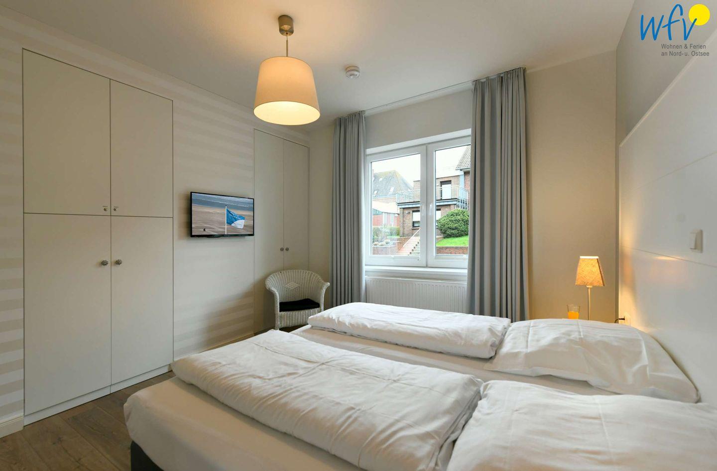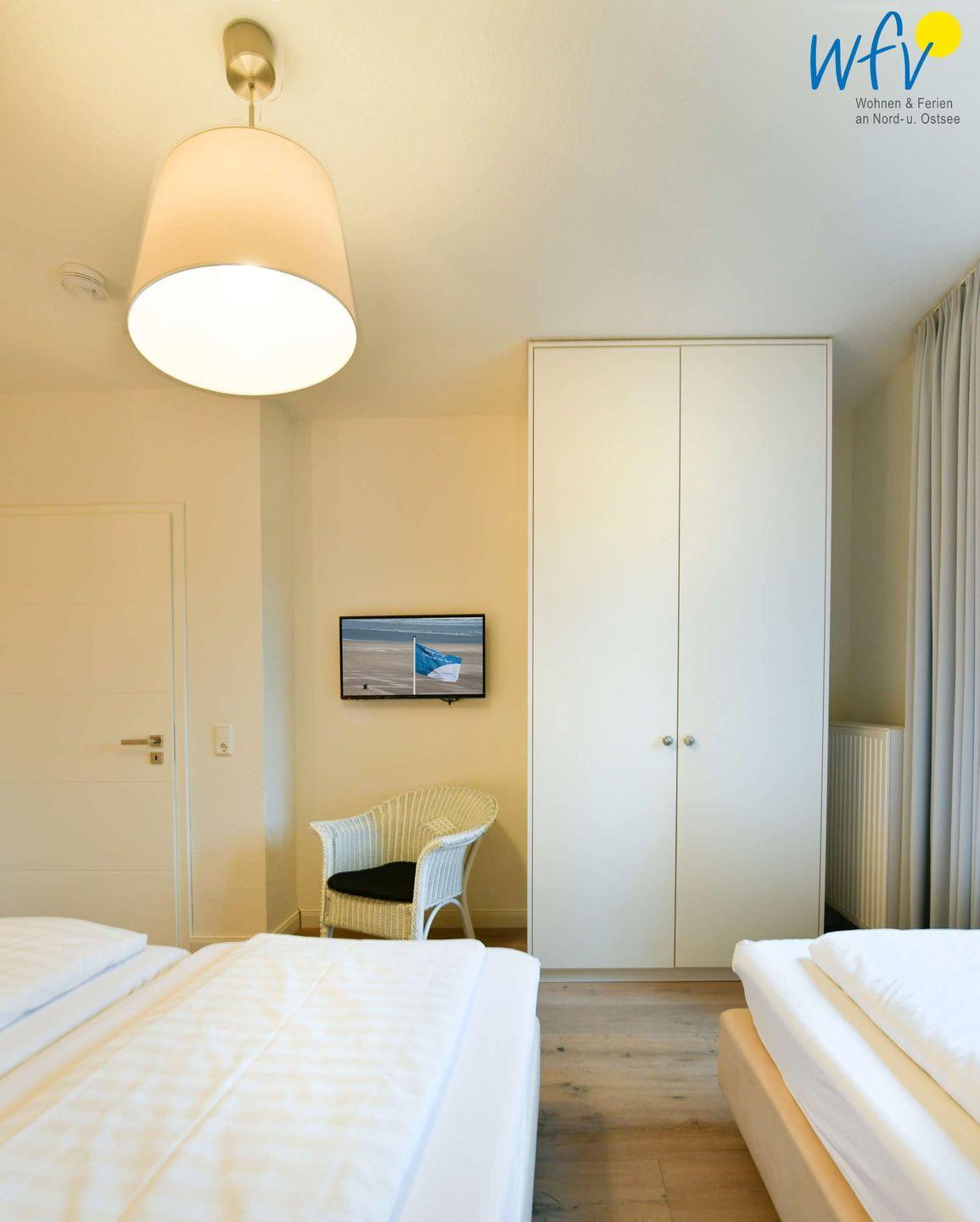 Wenn auf der Insel Ruhe einkehrt, warten auf Sie herrlich bequeme Boxspringbetten in den zwei separaten Schlafzimmern. Im zweiten Schlafzimmer befindet sich zudem ein zusätzliches Einzelbett. Flat-TVs zum gemütlichen Filmschauen sind in beiden Zimmern vorhanden sowie jeweils Stauraum für die Urlaubsgarderobe.