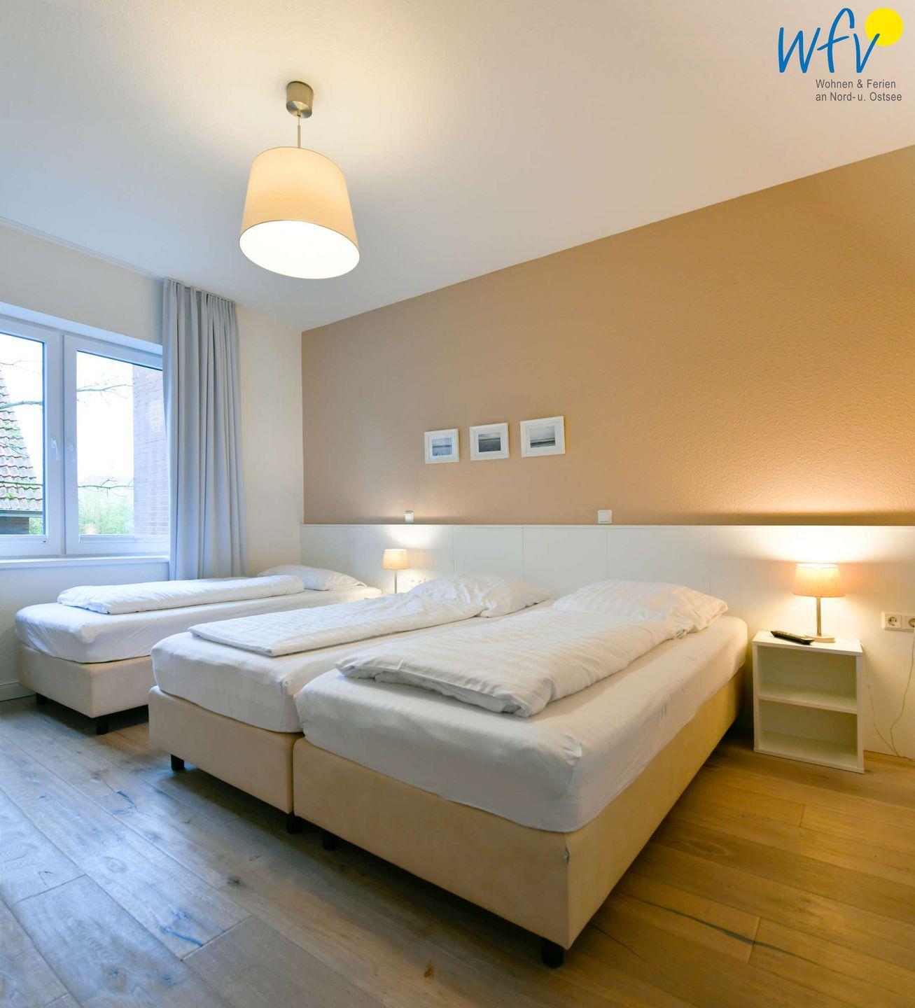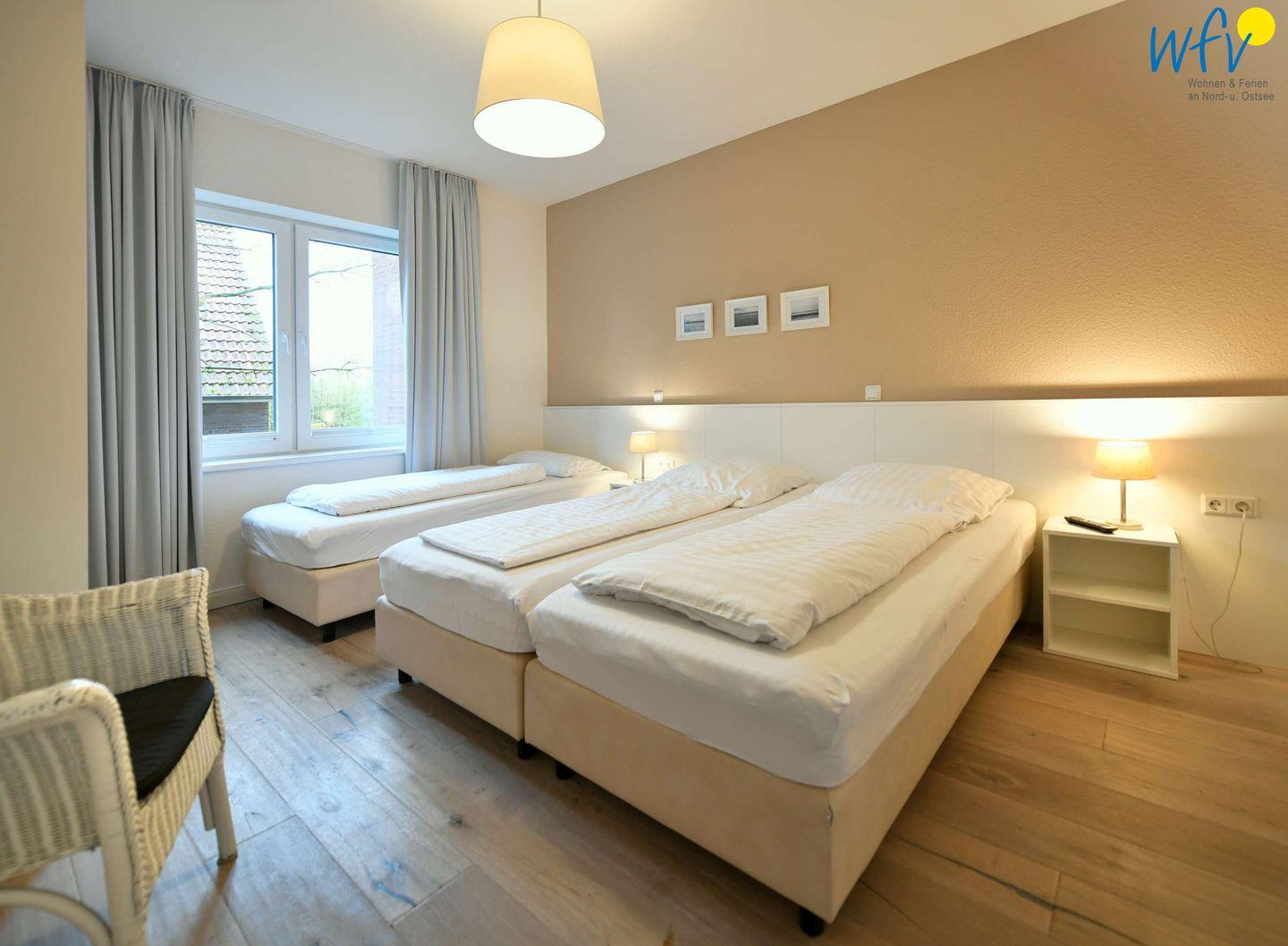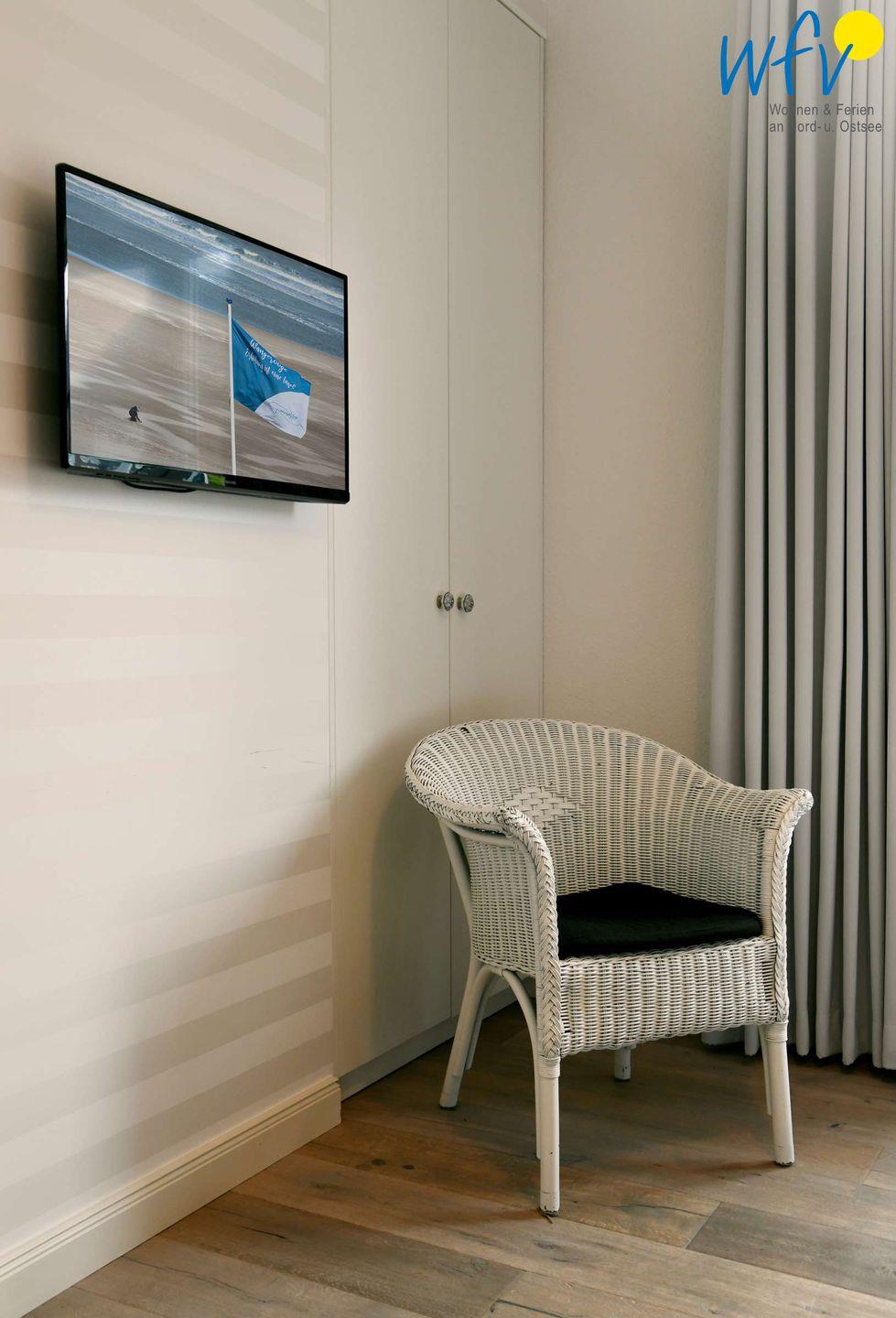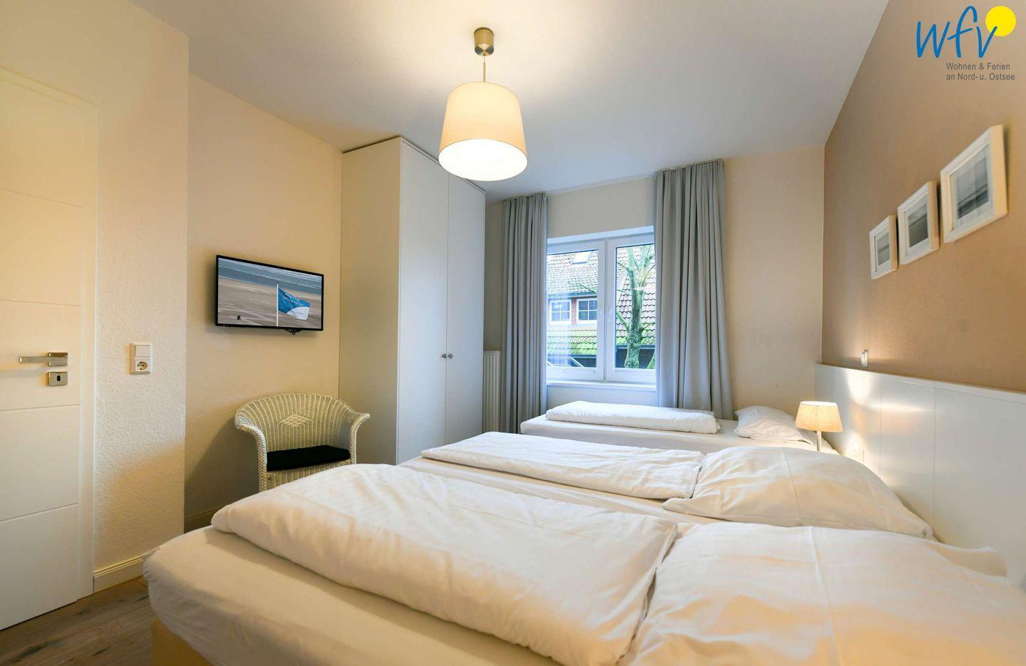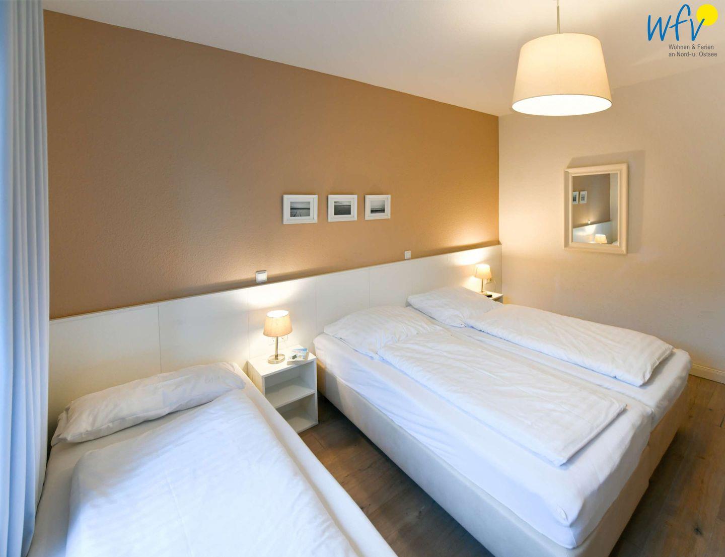 Wenn auf der Insel Ruhe einkehrt, warten auf Sie herrlich bequeme Boxspringbetten in den zwei separaten Schlafzimmern. Im zweiten Schlafzimmer befindet sich zudem ein zusätzliches Einzelbett. Flat-TVs zum gemütlichen Filmschauen sind in beiden Zimmern vorhanden sowie jeweils Stauraum für die Urlaubsgarderobe.