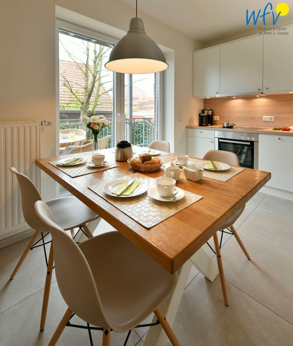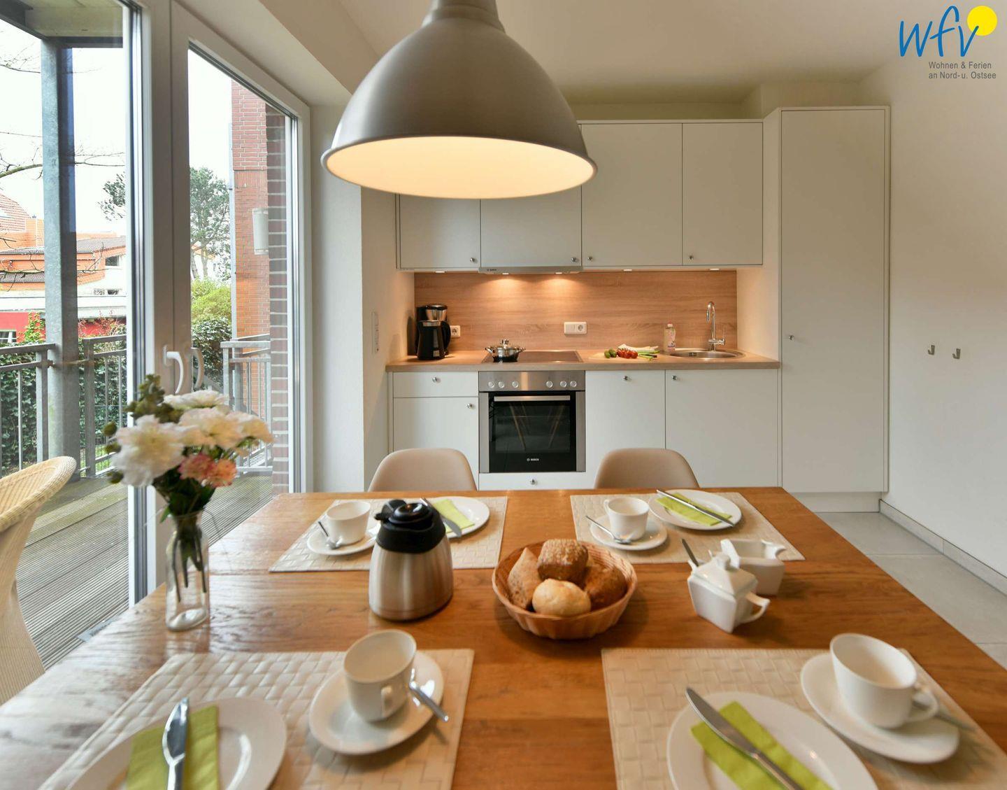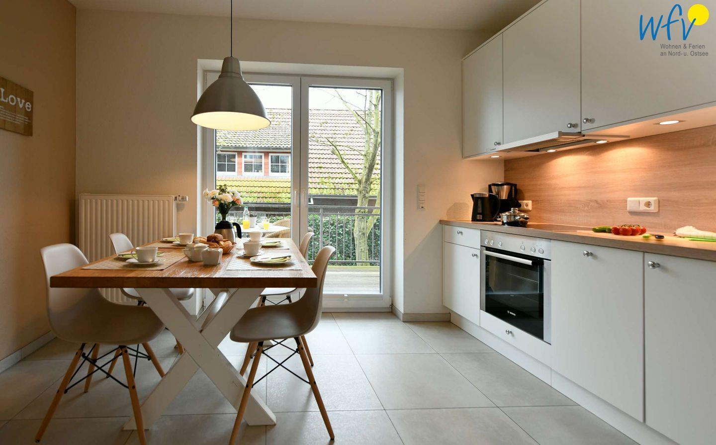 Vielleicht werden Sie in Ihrem Urlaub auf Wangerooge zum Gourmet! Die separate voll ausgestattete Küche macht Lust aufs Kochen und Zubereiten (u.a. Induktionsherd, Backofen, Mikrowelle und Spülmaschine). Zwischendurch können Sie frische Nordseeluft auf dem Süd-Balkon schnuppern. Von der Küche aus haben Sie einen direkten Zugang.
