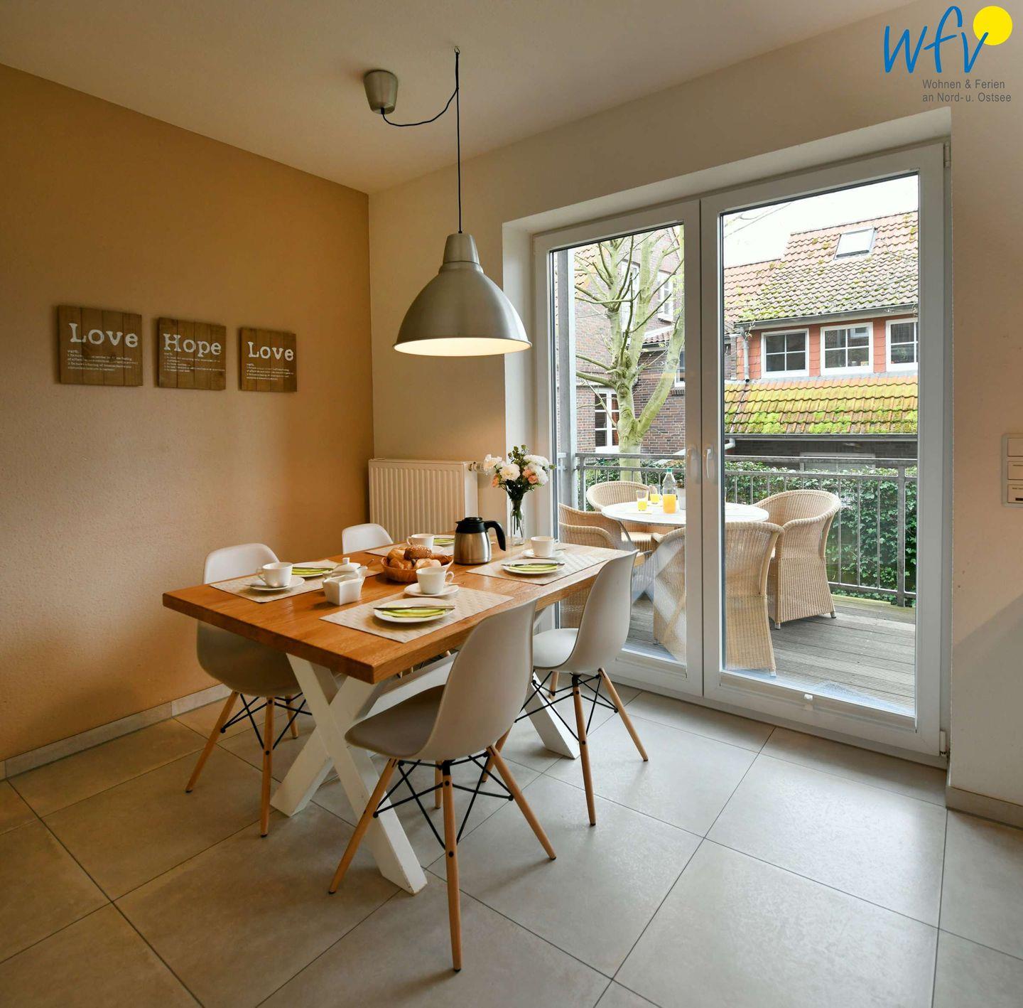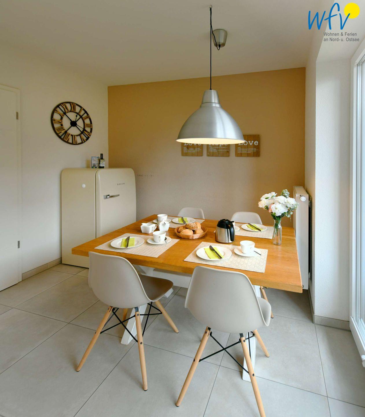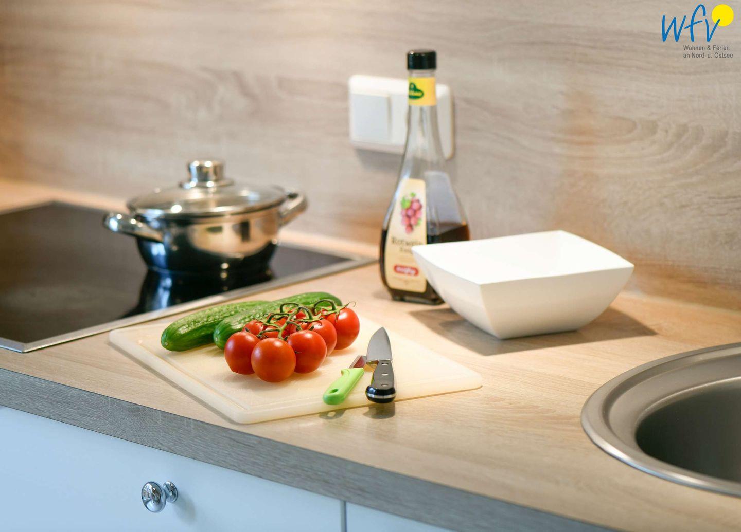 Vielleicht werden Sie in Ihrem Urlaub auf Wangerooge zum Gourmet! Die separate voll ausgestattete Küche macht Lust aufs Kochen und Zubereiten (u.a. Induktionsherd, Backofen, Mikrowelle und Spülmaschine). Zwischendurch können Sie frische Nordseeluft auf dem Süd-Balkon schnuppern. Von der Küche aus haben Sie einen direkten Zugang.