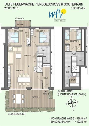 Die größte Unterkunft im Haus (ca. 124 m²) ist auf zwei Ebenen aufgeteilt und somit ein idealer Urlaubsort für 4 Erwachsene und 2 Kinder oder 6 Erwachsene.