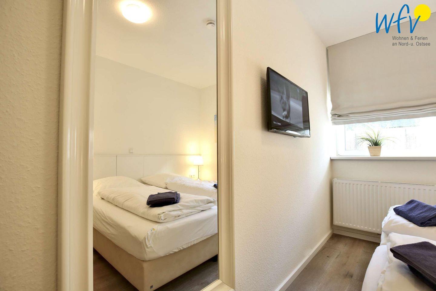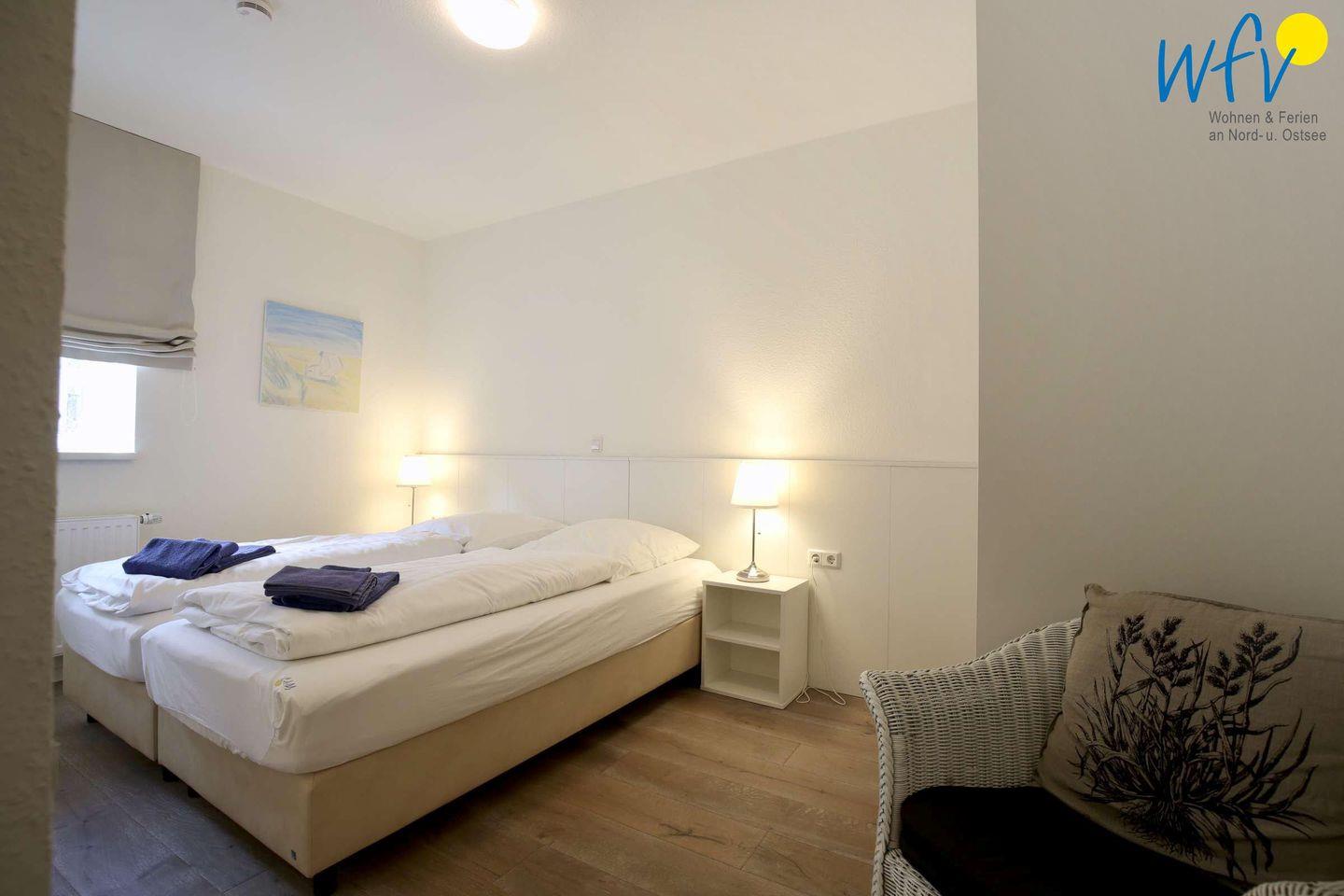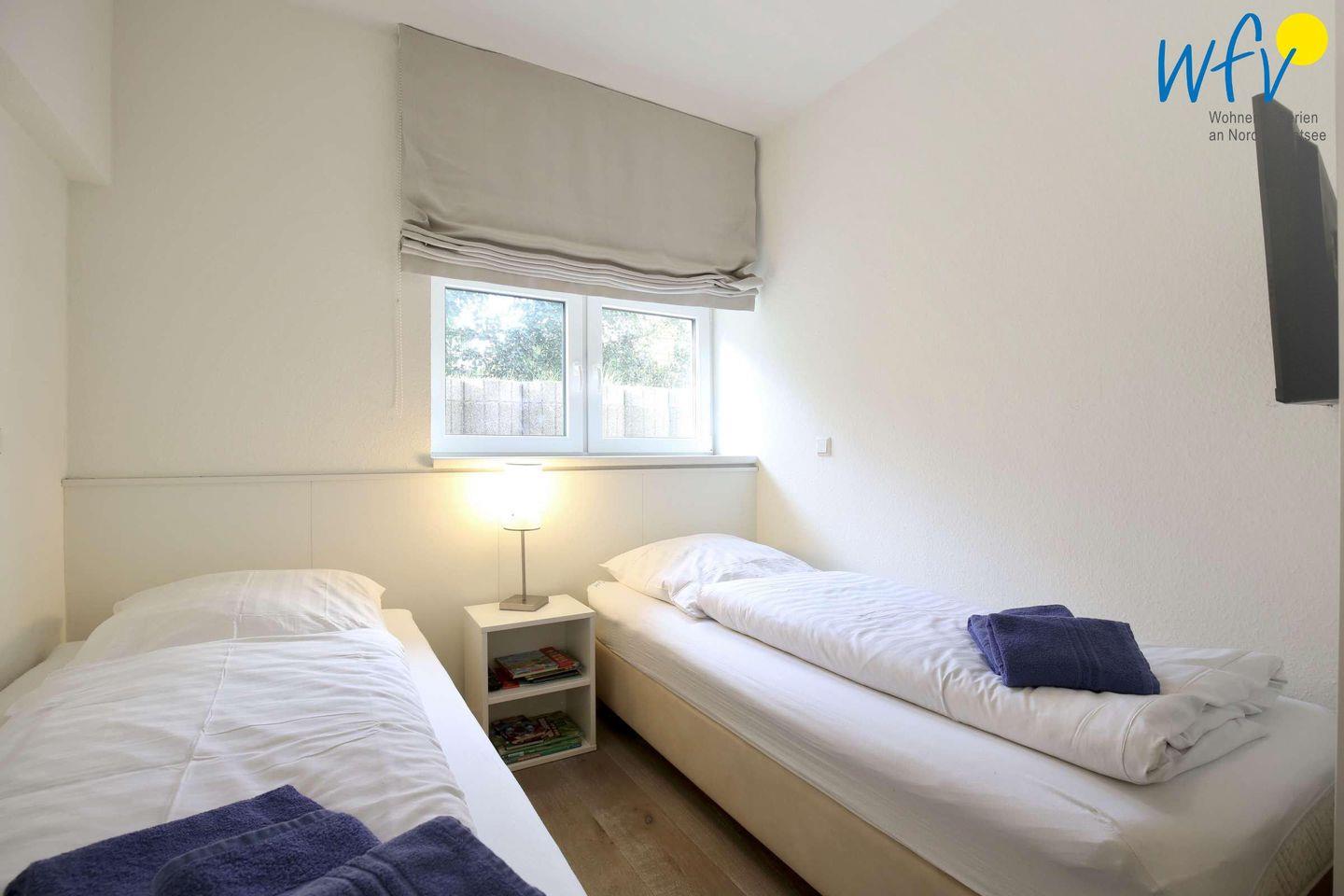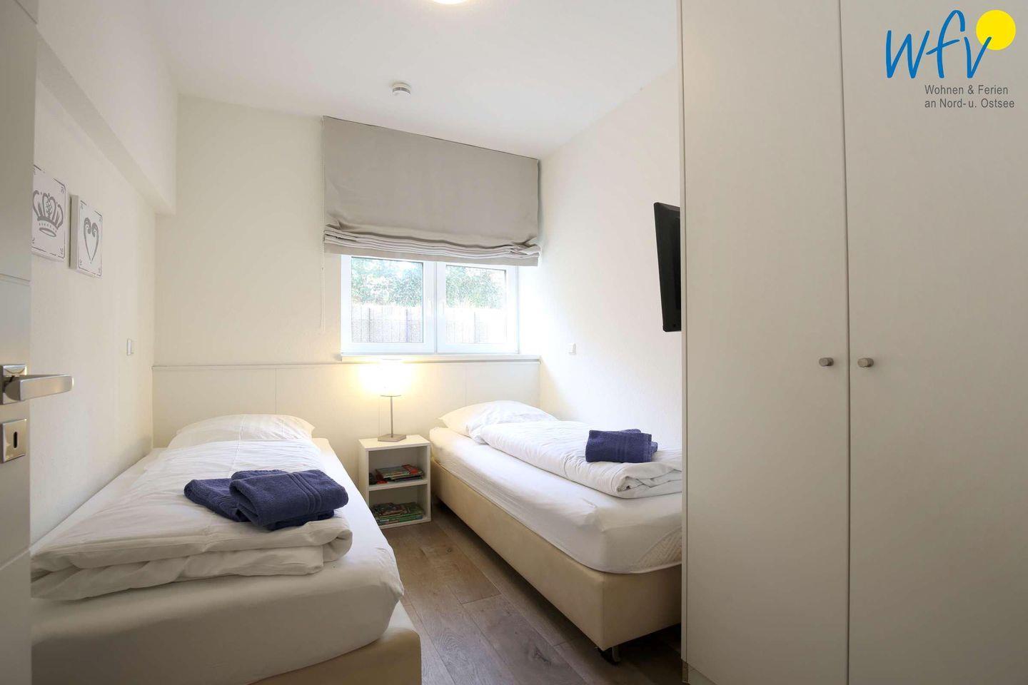 Im Souterrain befinden sich die beiden separaten Schlafzimmer, die jeweils mit bequemen Boxspringbetten und einem Flat-TV ausgestattet sind. Das erste Schlafzimmer verfügt über zwei Einzelbetten und das zweite Schlafzimmer über ein Doppelbett.