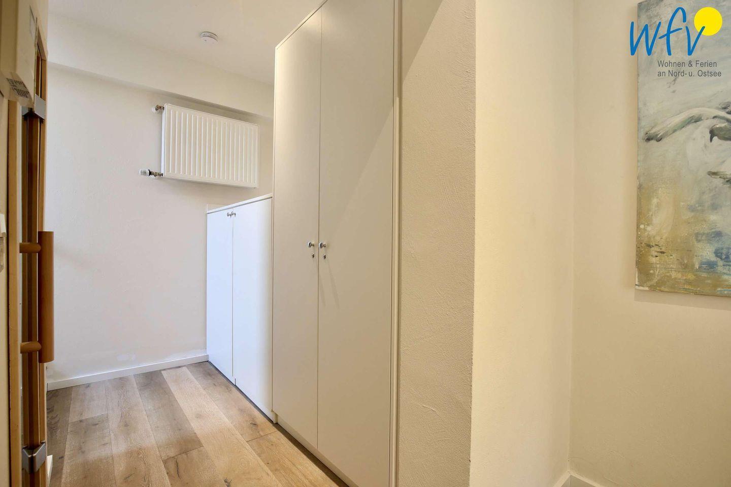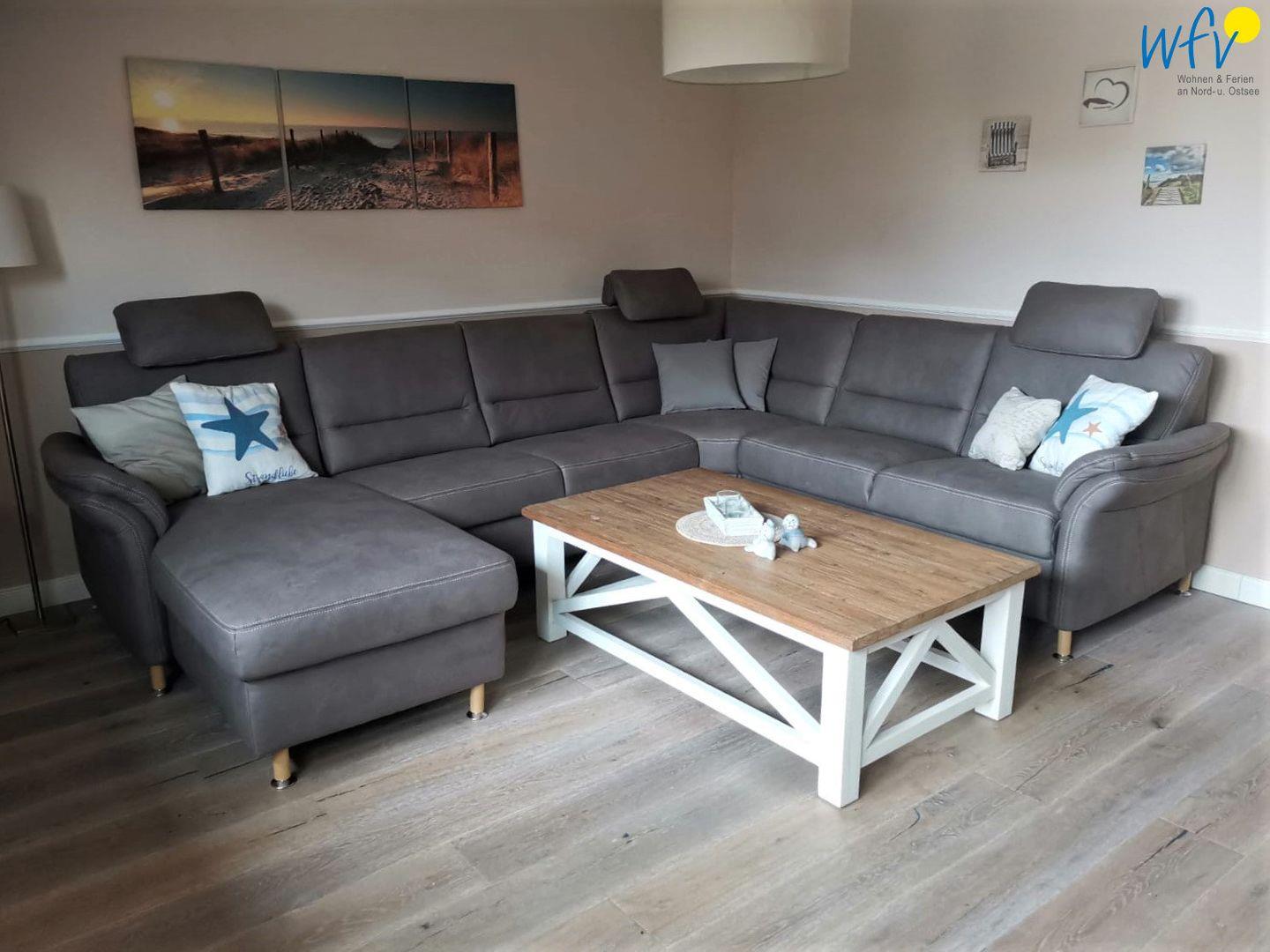 Im Erdgeschoss befindet sich der helle und freundlich eingerichtete Wohnbereich mit direktem Zugang zum Süd-Balkon. So können Sie entweder Sonnenstrahlen und frische Nordseeluft im Freien tanken oder eine gemütliche Zeit auf der Couchlandschaft im Wohnbereich verbringen. Für gute Filme stehen ein modernes Flat-TV mit Soundbar und ein Blu-ray-Player bereit.